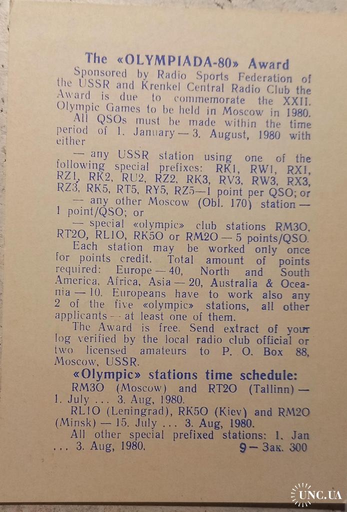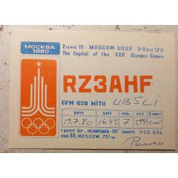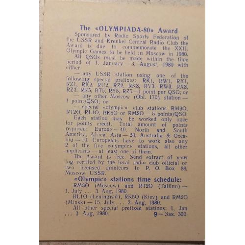 1961-1980На лицевой стороне имеется эмблема Олимпиаы-80 и позывной сигнал со специальным префиксом RZ3 из Москвы. Связь с этим оператором дает 1 очко для радиолюбительского диплома «Олимпиада-80». Здесь же имеются данные радиообмена в эфире. На обратной стороне приведены условия выполнения радиодиплома «Олимпиада-80» (перевод подробностей условий в наше время не актуаен). Карточка без дефектов. Состояние отличное.