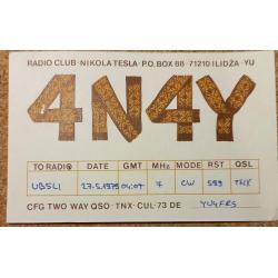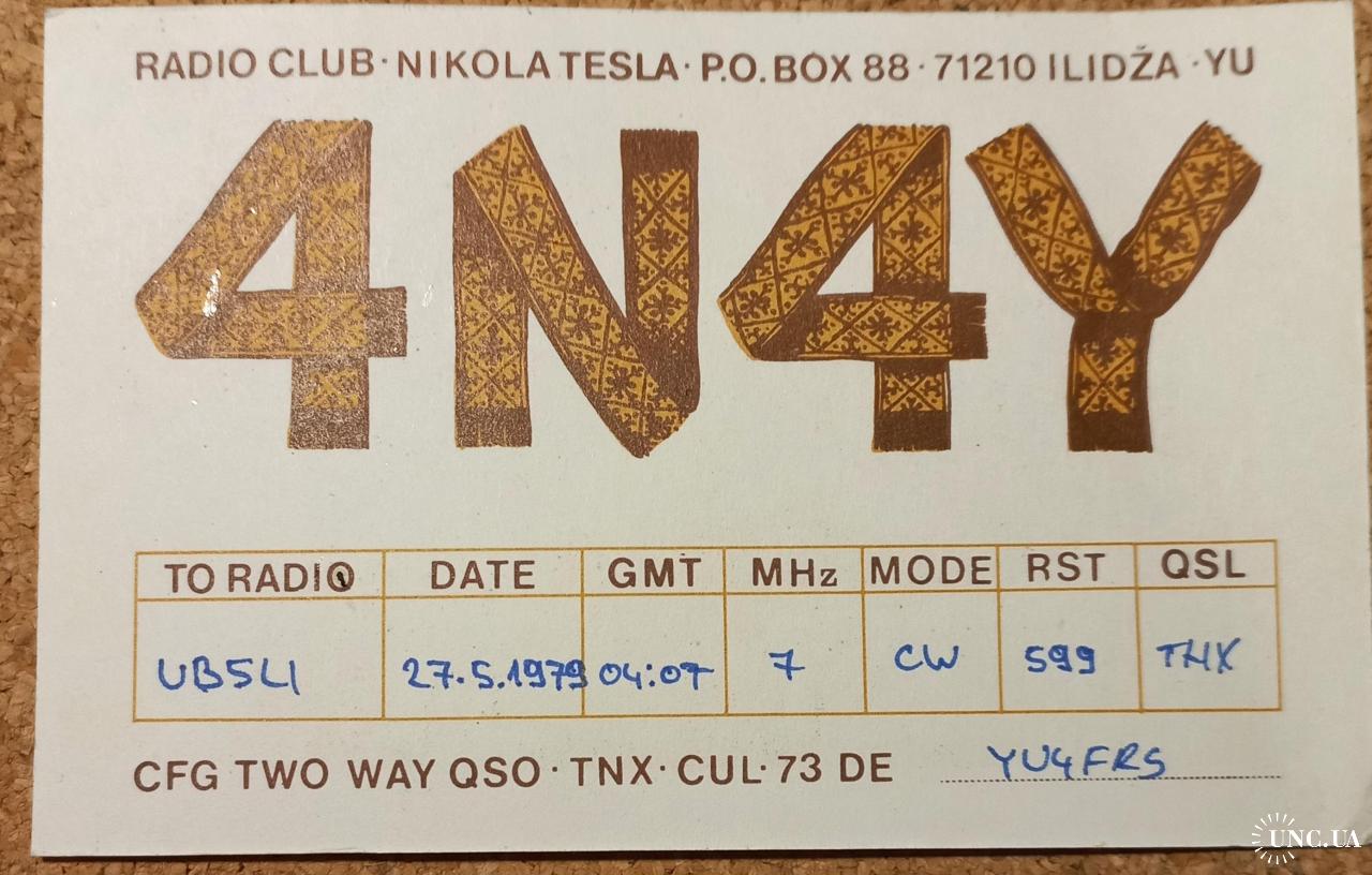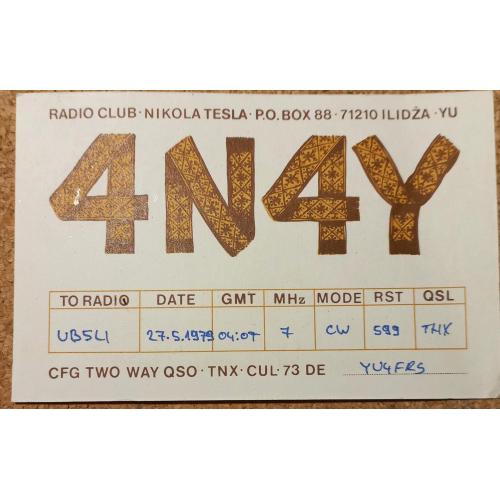 1961-1980На лицевой стороне юбилейный орнамент к столетию фабрики (1879-1979) и позывной- сигнал югославской любительской станции (ныне это Босния и Герцеговина). Илиджа – пригород Сараево. На обратной стороне видно, что эта станция является коллективной и принадлежит клубу «Никола Тесла». Здесь же приведены данные радиообмена в эфире. Карточка без дефектов. Состояние отличное.