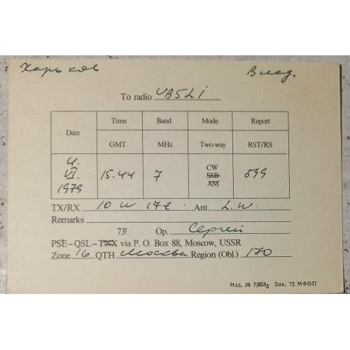 На лицевой стороне изображены флаги 15 союзных республик, входящих в СССР. Внизу контурные очертания страны Советов и эмблемы всесоюзных радиолюбительских органов. На фоне контура стоит штамп позывного-сигнала радиолюбителя На обратной стороне – данные радиообмена в эфире. Карточка без дефектов. Состояние отличное.