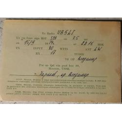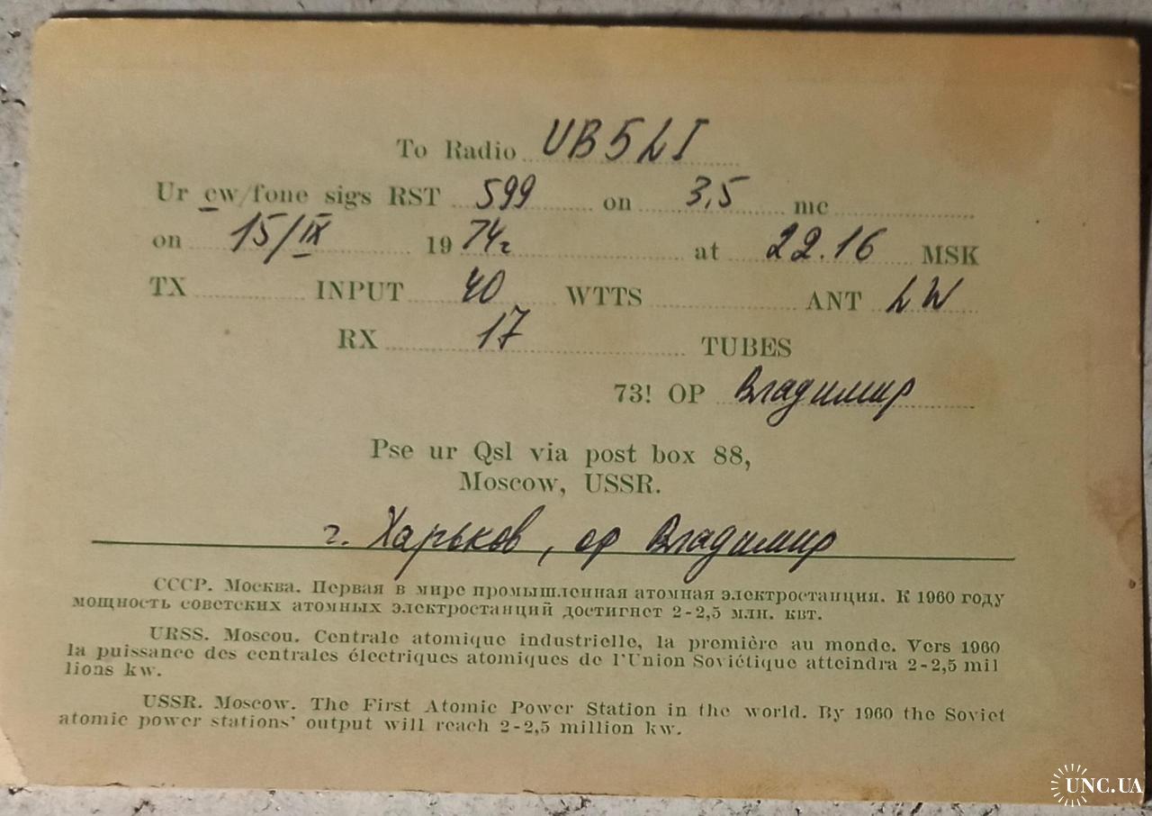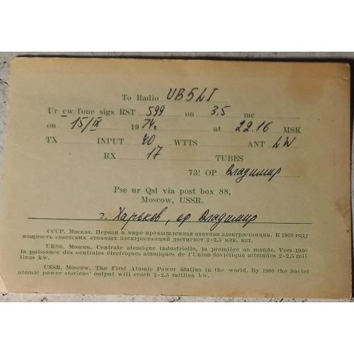 На лицевой стороне изображена первая в мире промышленная атомная электростанция. Она была запущена 27 июня 1954 года в городе Обнинске (Калужская область, СССР). Станция мощностью 5 МВт была подключена к энергосистеме, ознаменовав начало использования «мирного атома». Станция проработала почти 48 лет и была остановлена в 2002 году. История выпуска типовых бланков QSLв СССР показывала хронологию достижений Страны Советов на протяжении всего существования, поддерживая патриотический дух советских радиолюбителей и рекламируя страну в остальном мире. Также в правой верхней части стоит штамп позывного-сигнала коллективной радиостанции. На обратной стороне приведены данные радиообмена в эфире, которые мог заполнить любой советский радиолюбитель. Тираж таких типовых бланков регулярно пополнял запасы радиоклубов ДОСААФ на местах, что позволяло их использовать многие годы. Это, например видно по дате заполнения данной карточки (1974 г.) коллективной радиостанцией из Волгограда по прошествии многих лет после выпуска тиража. Видны следы времени. Состояние хорошее.