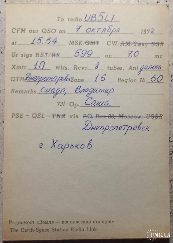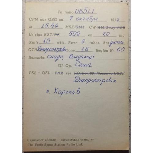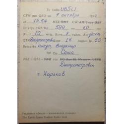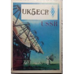 Такие бланки распространялись по всем радиоклубам ДОСААФ в СССР. Цена чистого бланка 1 коп. На лицевой стороне изображены антенны космической станции «Земля – Космос». Вверху стоит штамп с позывным – сигналом коллективной любительской станции из Днепропетровска, а также эмблема Центрального радиоклуба ДОСААФ в Москве. На обратной стороне – данные радиообмена в эфире. Для интересующихся подробностями хочу пояснить радиожаргонное слово “cuagn” в графе “Remarks”. Оно означает фразу “SeeYouagain” (Увидимся снова!), а также выражение «PSE- QSL-TNX”,что означает “Pleace-Receiptcard-ThankYou (Пожалуйста- Карточку-квитанцию – Спасибо). Карточка без дефектов, кроме следов времени. Состояние хорошее.
