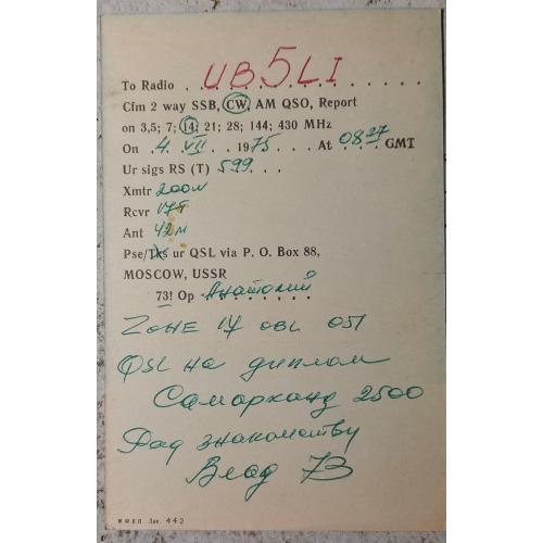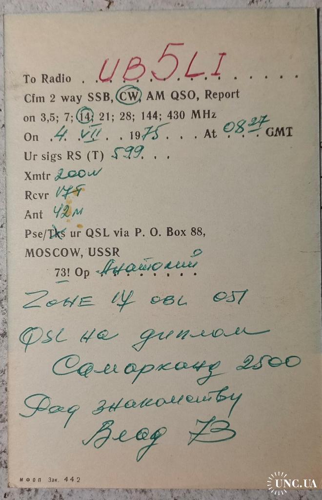 Такие бланки распространялись через радиоклубы ( более позднее название - радиошколы) ДОСААФ за 1 коп. по всей территории СССР. На лицевой стороне логотип шрифта журнала «Радио», сохранившийся и поныне. Журнал «Радио» был основан в 1924 году. Первый номер вышел 15 августа 1924 года под названием «Радиолюбитель». Свое нынешнее название журнал получил в 1946 году.С этого же года принято считать и начало радиолюбительства в СССР. На карточке стоит штамп позывного-сигнала радиолюбителя из Самарканда. На обратной стороне заполнены данные радиообмена в эфире. Карточка без дефектов. Состояние отличное.