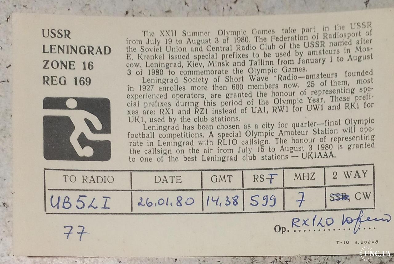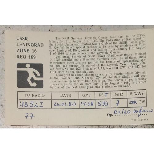 XXII летние олимпийские игры проходили в СССР с 19.07 по 03.08. 1980 г. В честь Олимпиады Федерация радиоспорта и Центральный радиоклуб СССР ввели специальные префиксы к позывным-сигналам любительских станций в ряде городов. где проводились олимпийские мероприятия по различным видам спорта. К числу этих городов относились: Москва, Ленинград, Киев, Минск и Таллинн. Такие префиксы выдавались на период с 01.01 по 03.08 1980 ведущим радиоспортсменам этих городов в качестве преференций при ведении радиосвязей. т.к. вызывали у радиолюбителейпо всему миру повышенный интерес, что резко повышало трафик активности, Такой своеобразный “pileup” (свалка в эфире) повышало адреналин у операторов с такими префиксами. Это состояние ажиотажного интереса к себе может понять только тот. кто был увлечен романтикой путешествий по эфиру, кто испытывал эйфорию от спортивного азарта таких моментов. . По окончании этого периода специальные префиксы снова возвращались к прежнему виду. Например RX1DZ становился к своему первичному виду UA1DZ. Ленинград Был выбран городом четверть-финалаолимпийских матчей Олимпиады. На лицевой стороне карточки слева изображена эмблема Олимпиады-80, а справа позывные-сигналы самых опытных радиолюбителей Ленинграда и области со специальными префиксами. Карточка без дефектов. Состояние отличное.