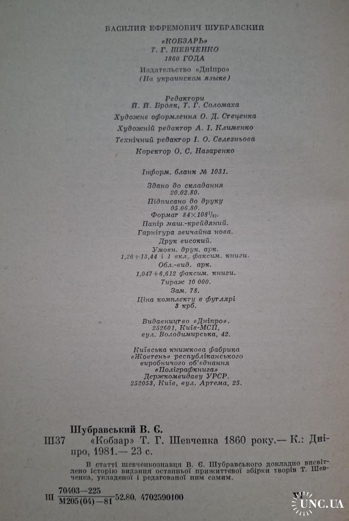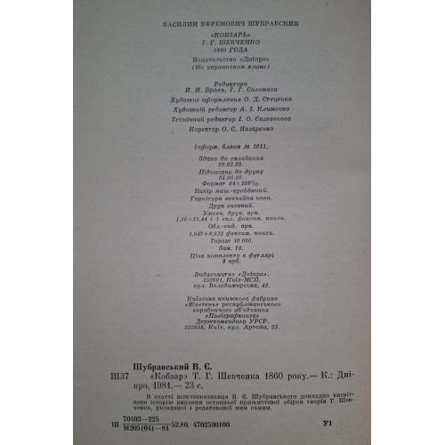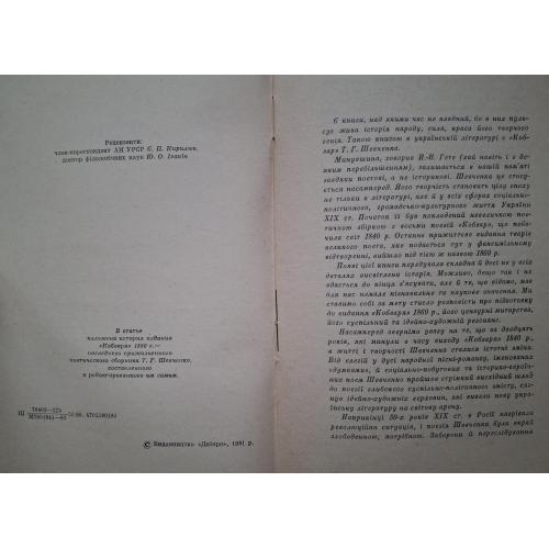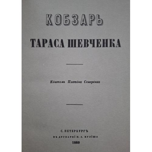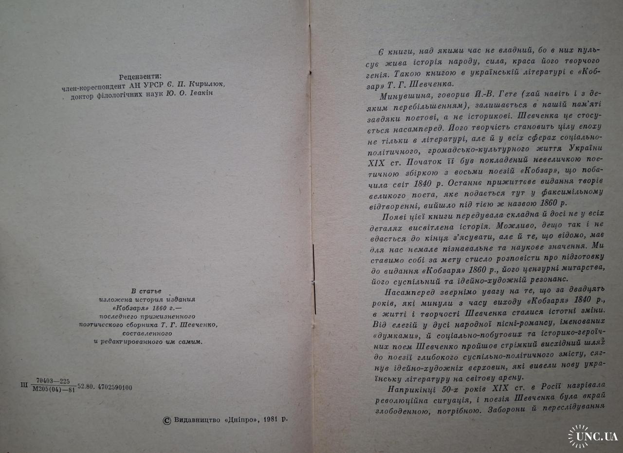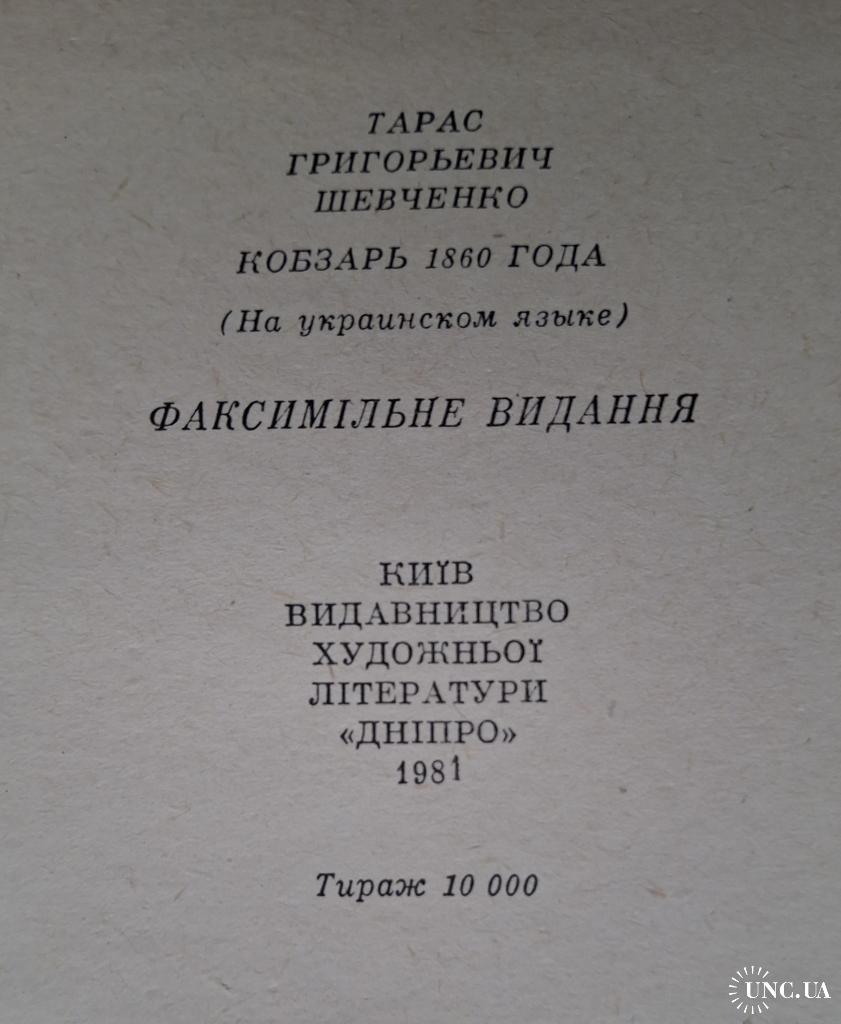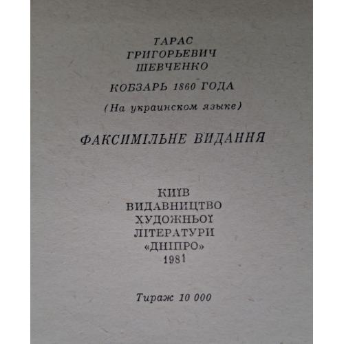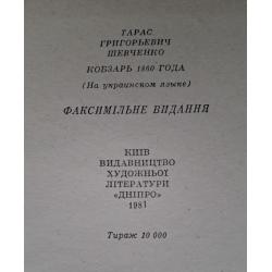 Кобзарь. Є книги, над якими час не владний, бо в них пульсує жива історія народу, сила, краса його творчого генія. Такою книгою в українській літературі є “Кобзарь” Тараса Григоровича Шевченка. Після смерті поета, у факсимільному відтворенні, видавався Кобзар 1860 року. Цей репринт Кобзарь був надрукований в 1981 році в місті Київ, видавництвом художньої літератури “Дніпро”, тиражем 10000 екземплярів. Комплект складається з репринту книги “Кобзар”, предмови до факсімільного видання “Кобзаря” 1860 року, футляра з назвою.