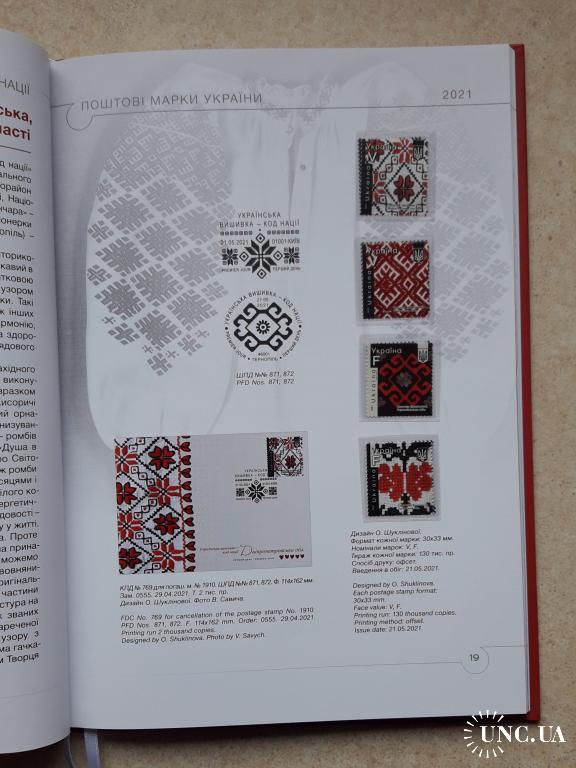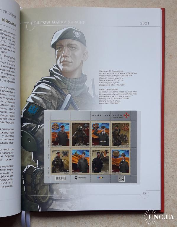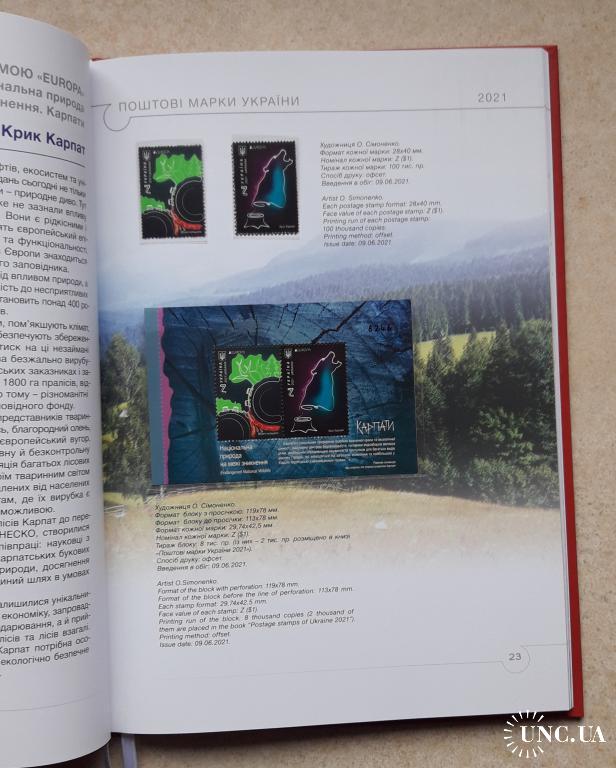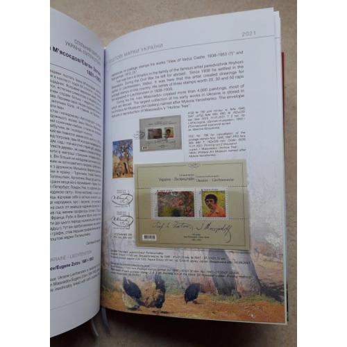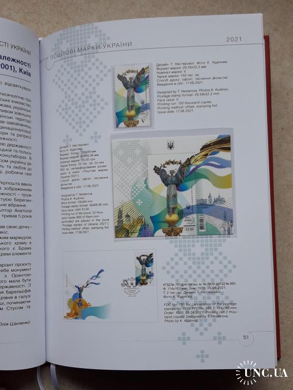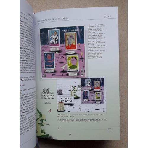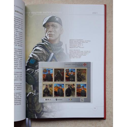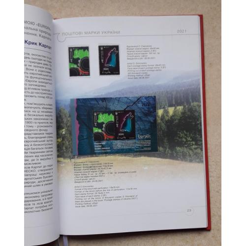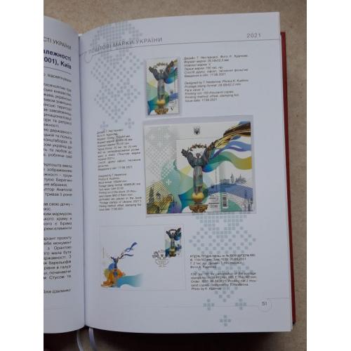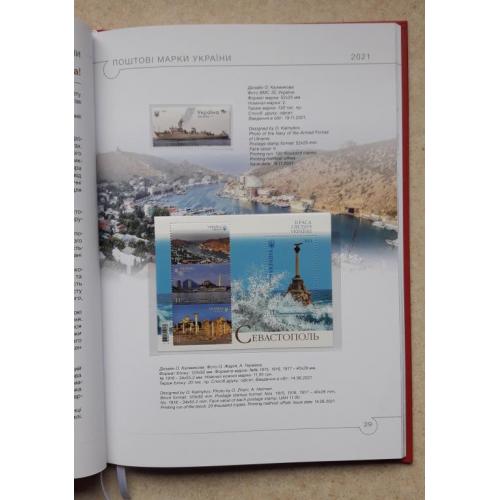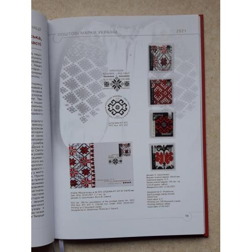 Річна книга з марками «Поштові марки України 2021» містить комплект поштових марок, блоків та маркових аркушів, випущених Укрпоштою впродовж 2021 року. Книга представлена у 2-х комплектаціях: Стандарт (1100 прим.) і Ексклюзив (900 прим.). В форматі Ексклюзив, окрім річного набору поштових марок, включено ексклюзивні випуски 2021 року - неперфорований блок «Монумент Незалежності (2001), Київ» та поштову марку «ХХХІІ літні Олімпійські ігри. Медальний залік України» з надруком. Кожен випуск супроводжує художній опис з технічними характеристиками двома мовами — українською та англійською. Поштові марки вкладені у книгу за допомогою клімташе, що забезпечує їх надійний захист та мобільність.