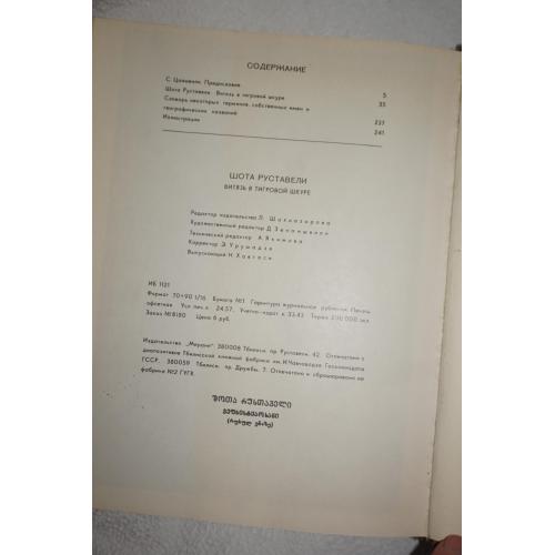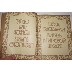 336 страниц, из них 90 страниц шикарных полноформатных иллюстраций и гравюр авторства Мамуки Тавакарашвили (XVII ст.), Михая Зичи (1827-1906), Ладо Гудиашвили (1896-1980), Серго Кобуладзе (1909-1978), Тамары Абакелиа (1905-1953), Ираклия Тоидзе (1902-1985), Левана Цуцкиридзе, Учи Джапаридзе (1906-1988), Натэлы Янкошвили (1918-2007), а также миниатюр неизвестного автора XVI столетия. Перевод выполнен этническим украинцем, поэтом и переводчиком Пантелеймоном Антоновичем Петренко (1908-1936), долгое время проживавшим в Грузии. Редакция Константина Чичинадзе (1891-1960), известного грузинского поэта. Считается, что перевод Петренко заметно лучше переводов других авторов передает монументальный характер поэмы, поскольку выполнен в эпическом стиле с успешным преодолением трудностей, возникающих при переводе, которые связаны с сложной художественной метафорической речью произведения. Переводчик максимально точно, с соблюдением катренной рифмы, передал оригинальный текст поэмы, благодаря чему данный вариант перевода на русский язык до сих пор считается самым удачным. Гибель Петренко в 1936 году (по официальной версии - упал со строящегося моста в реку Куру) не дала ему закончить задуманное полностью. Поэтому, перевод строф 1515-1578 был закончен поэтом и переводчиком Борисом Бриком (1904-1942), впоследствии репрессированным и расстрелянным в Сибири.
