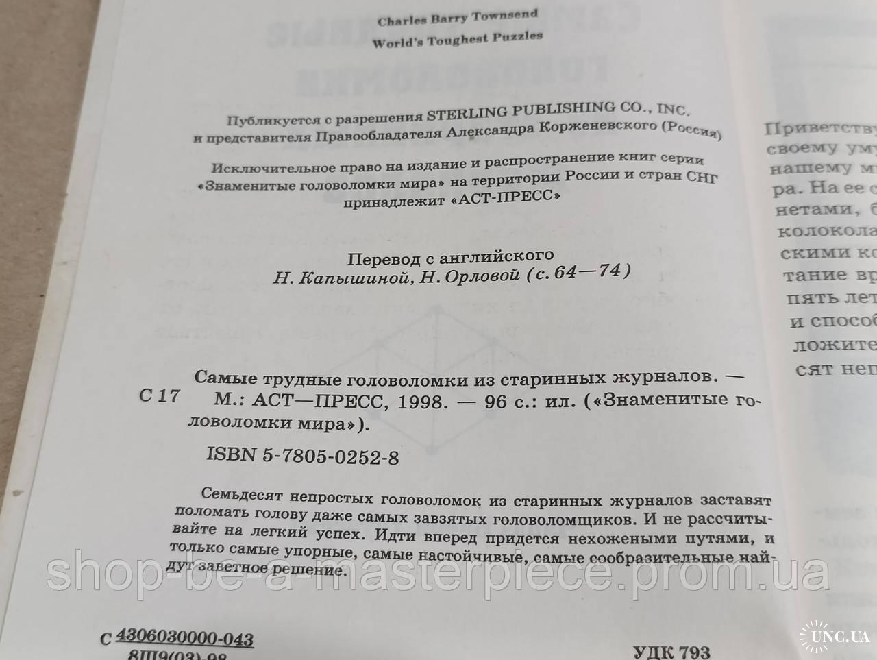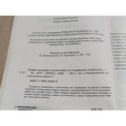 Самые трудные головоломки из старинных журналов 1998 Знаменитые головоломки мира Мягкая обложка Идеальное состояние М.). 96 с.: ил. Семьдесят непростых головоломок из старинных журналов заставят поломать голову даже самых завзятых головоломщиков. И не рассчиты вайте на легкий успех. Идти вперед придется нехожеными путями, и только самые упорные, самые настойчивые, самые сообразительные найдут заветное решение. Детективные головоломки Головоломки. Умные игры с карандашом и бумагой Сказочные головоломки Самые трудные головоломки из старинных журналов Самые головоломные головоломки в картинках Самые заковыристые головоломки Головоломки, нелепицы, обманки Звездные головоломки Головоломки. Математическая магия Самые занимательные головоломки Головоломное путешествие в мир головоломок Самые запутанные головоломки Самые невероятные головоломки Математические фокусы, игры, головоломки Головоломки. Волшебные картинки Старые головоломки на новый лад Самые классные головоломки Головоломки в шутку и всерьез Головоломки для самых умных Волшебный мир математических головоломок Сокровищница головоломокОтветы продавца на ваши вопросы