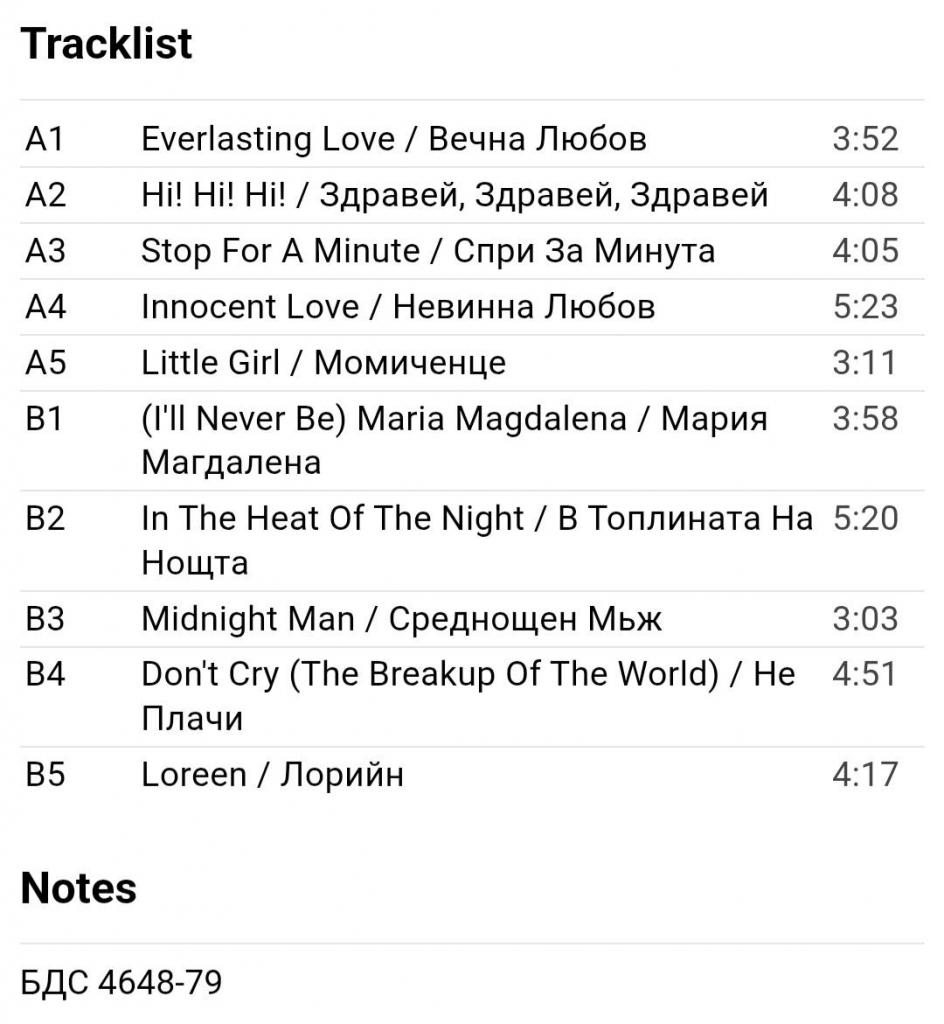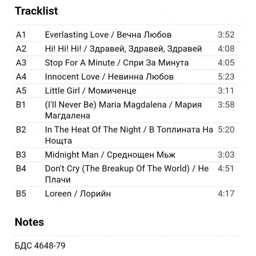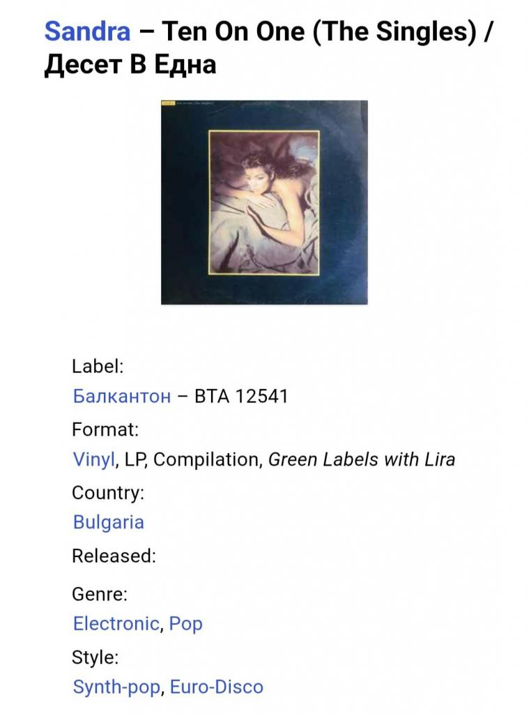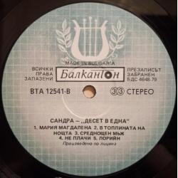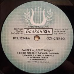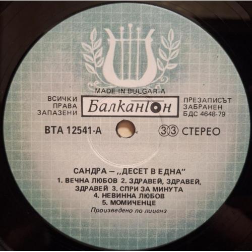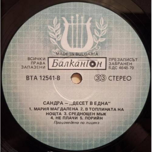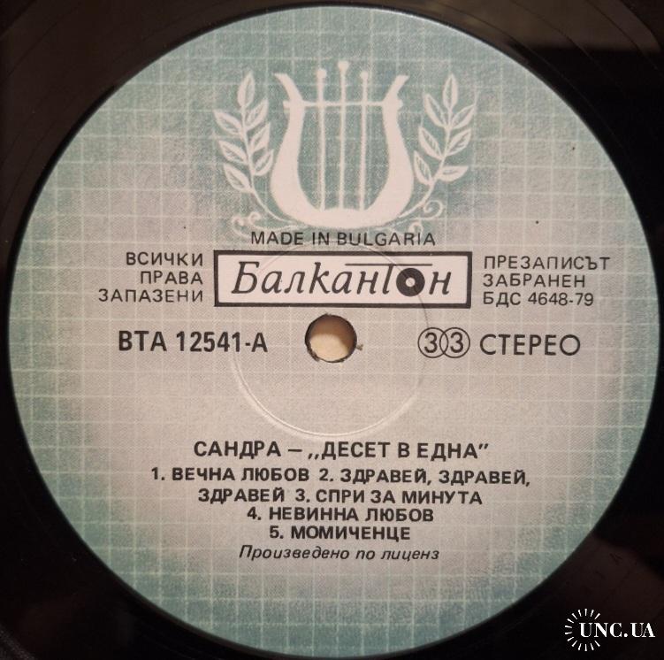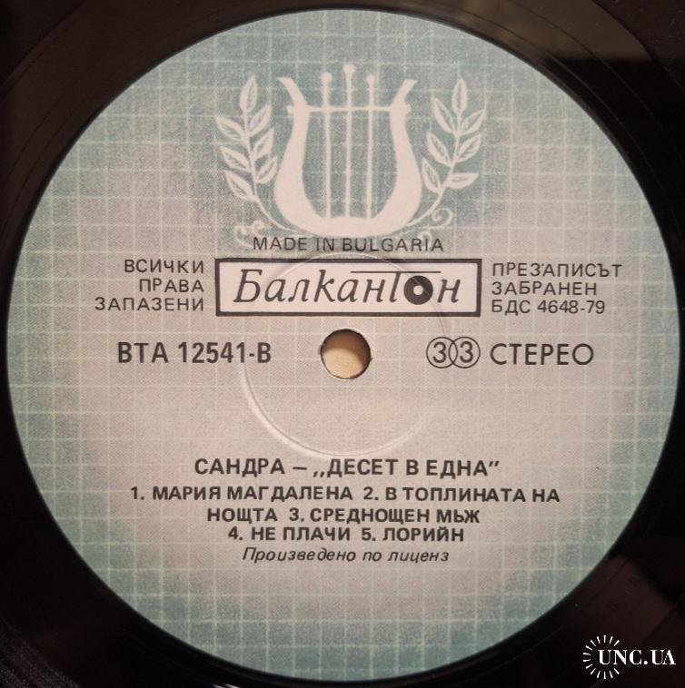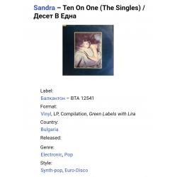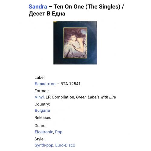 Вінілова платівка. Перша офіційна збірка хітів, яка складалась з синглів, Німецької синті поп, євро диско виконавиці, бувшої учасниці легендарної групи Арабески, Сандри Анни Лауер, по чоловікові Крету (Ten On One) 1987. Випуск фірми (Balkanton) Bulgaria, 1989-ий рік. Стан платівки ЕХ+. Рідкісний лейбл (Green Labels, With Lira). Стан конверту VG+. Відправка по Україні службами доставки: Нова Пошта, Укр Пошта, Делівері. Також відправляємо посилки за кордон по цілому світу.