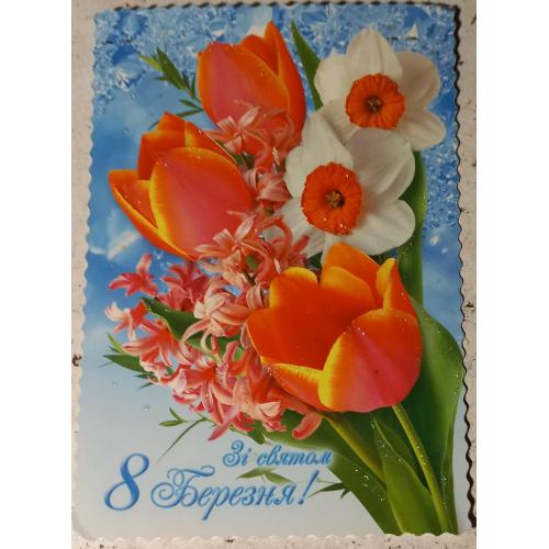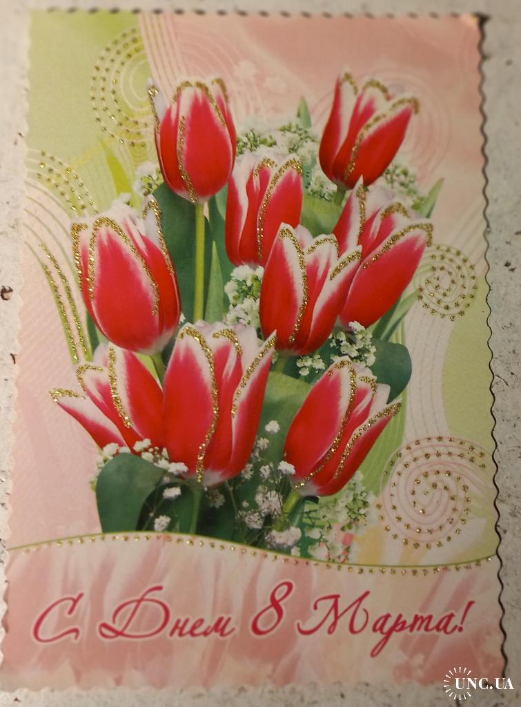 Открытка с глиттером (золотистыми блестками), с именным листком. Зi святом 8 Березня! Поздравлениемоей маме, участнице боевых действий в ВОВ с 8 Марта от Организации инвалидов войны. Вооруженных Сил и участников боевых действий Московского р-на г. Харькова.Открытка изд-ва «Мистецтво». Без дефектов. Состояние отличное.