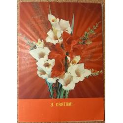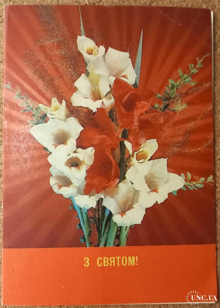 Фото открытка. З святом.Двойная. ФотоИ.Дергилева. 1991 г. Эта открытка создана на стыке распада СССР и Образования Независимой Украины. Об этом свидетельствует сравнение титульной страницы с надписью «З Святом!» и последней страницы с надписью «С праздником». а также фактом издания Минсвязи СССР, 1991 г. и печатью 16.11.90 г. тиражом 0,4 млн. В издательском деле, как и в других сферах существовало много неопределенностей переходного периода. Очевидно , что и титульная страница претерпела изменения, связанные с заменой надписи на русском на украинский язык уже украинским издателем. Судя по тексту на развороте бланк открытки использовался долгое время и после распада СССР в виду отсутствия видимого антагонизма новообразованных государств. В данном случае это видно на примере Харьковского Обкома ветеранов войныв 1997 г. Открытка без дефектов. Состояние отличное.