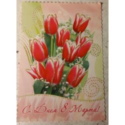 Открытка с глиттером (золотистыми блестками), С Днем 8Марта! Размер 295х105. Открытка изд-ва «Мистецтво». Без дефектов. Состояние отличное.