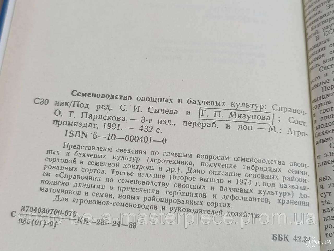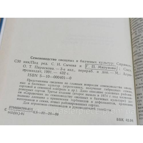 Семеноводство овощных и бахчевых культур: Справочник Под ред. С. И. Сычева и Г. П. Мизунова; Сост О. Т. Параскова 1991 Твердая обложка. Состояние идеальное 3-е изд., перераб. и доп. — М.: Агро-промиздат, 1991. — 432 с. Представлены сведения по главным вопросам семеноводства овощных и бахчевых культур (агротехника, получение гибридных семян, сортовой и семенной контроль и др.). Дано описание основных районированных сортов. Третье издание (второе вышло в 1974 г. под названием «Справочник по семеноводству овощных и бахчевых культур») до-полнено данными о применении гербицидов и дефолиантов, хранении маточников и семян, новых районированных сортах. Для агрономов-семеноводов и руководителей хозяйствОтветы продавца на ваши вопросы