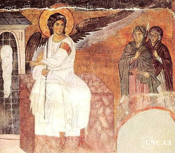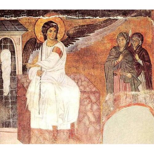 Фреска находится на южной стороне церкви и входит в композицию Жены-мироносицы. Ангел, облачённый в белый хитон, сидит на камне и своей рукой указывает женам-мироносицам на пустую гробницу Христа.