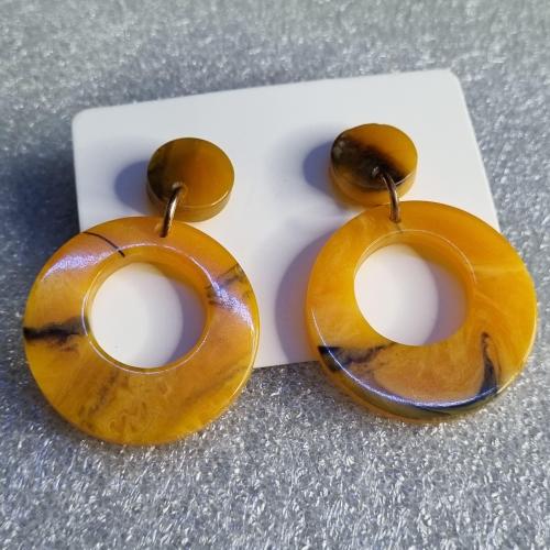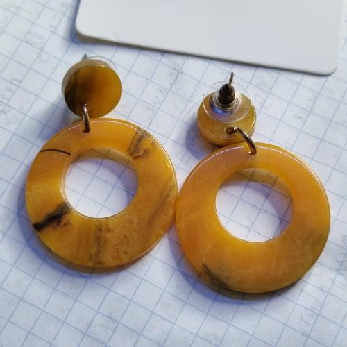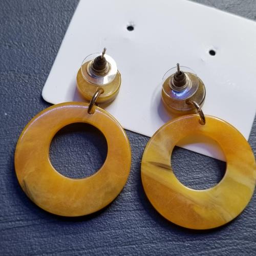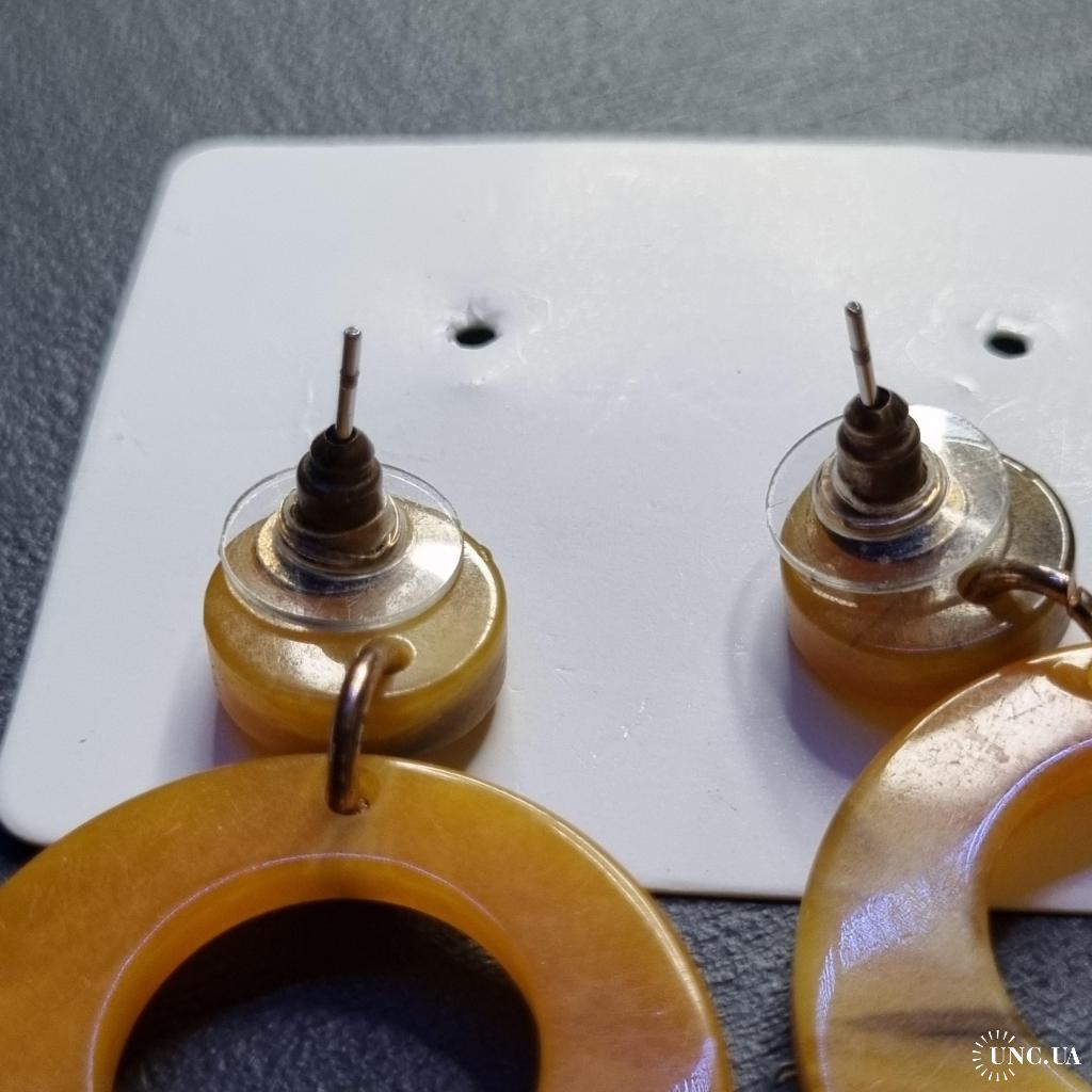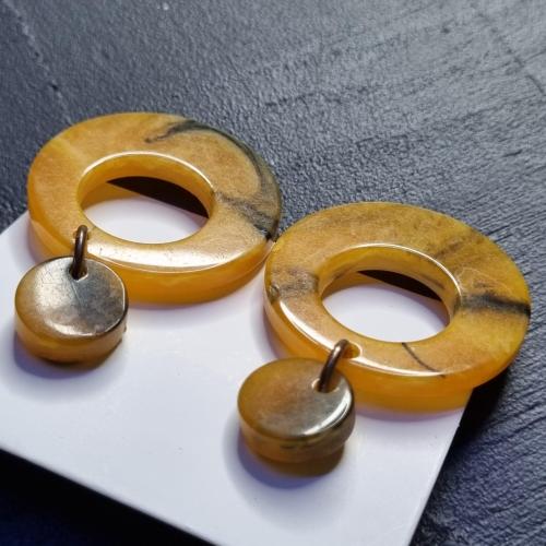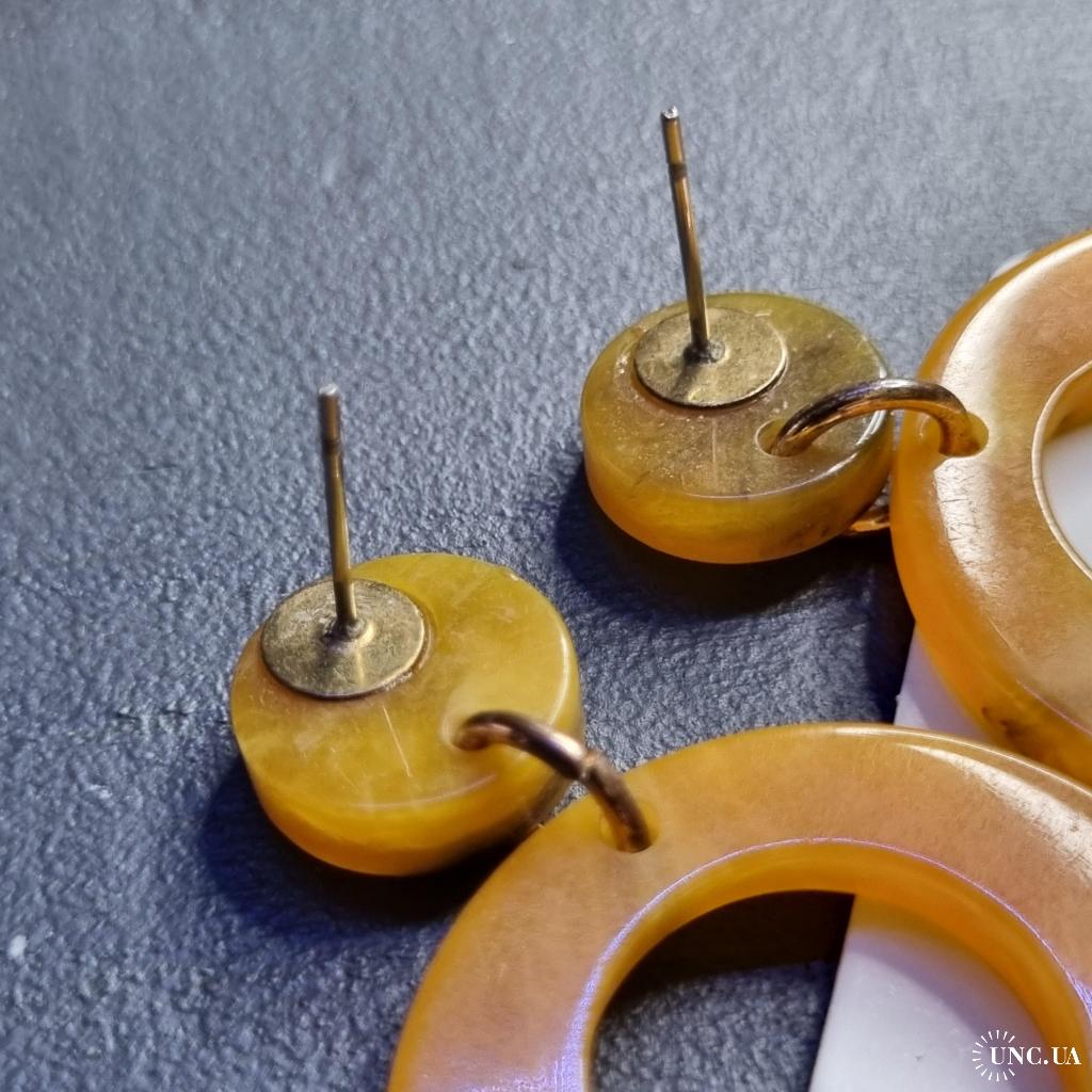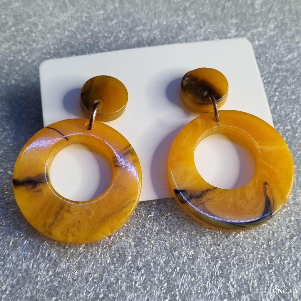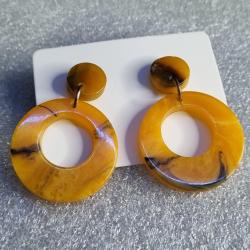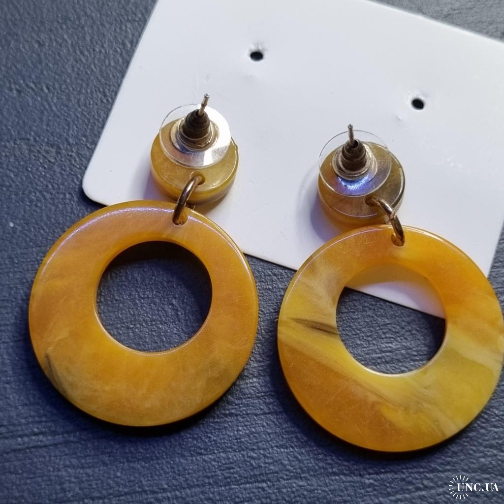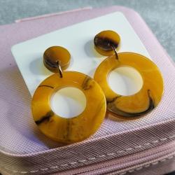Круглі сережки з мармуровим візерунком у теплих відтінках бурштину, чорного та коричневого. Легкі, глянцеві, з металевими застібками. Ідеальні для поціновувачів ретро-аксесуарів або як яскравий акцент до сучасного образу. Виглядають ефектно як на фото, так і в реальності.