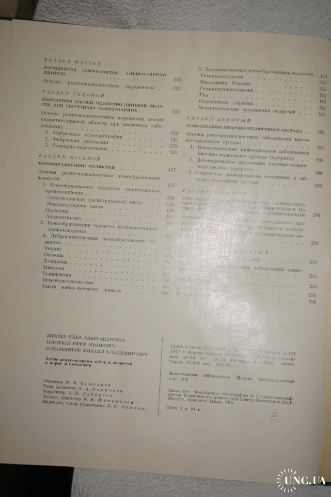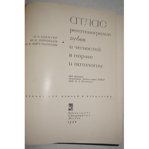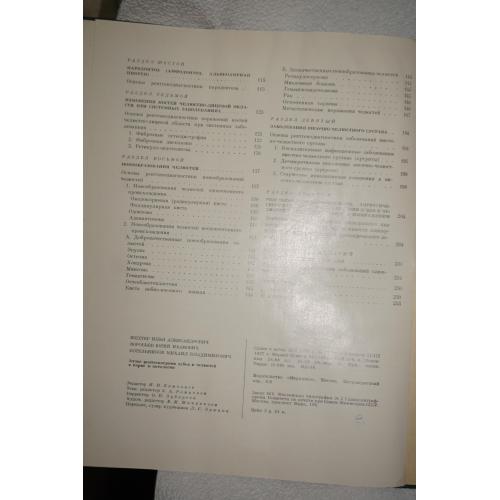 Настоящий атлас имеет своей целью представить типичные рентгенограммы, отражающие изображение как нормы с учетом возрастных особенностей, так и важнейших заболеваний зубов и челюстей. Кроме того, атлас содержит рентгенограммы, показывающие возможности использования рентгенологического исследования как метода контроля и учета эффективности консервативных и хирургических методов лечения в стоматологии. Атлас состоит из краткого введения, изложения практических основ методики и техники рентгенологического исследования зубов и челюстей и 11 специальных разделов, содержащих фотоотпечатки с оригинальных рентгенограмм в норме и при важнейших заболеваниях зубов и челюстей, а также отдельные пояснительные схемы к ним. Все рисунки (отпечатки с рентгенограмм) сопровождены достаточно подробным описанием наблюдаемой рентгенологической картины. Каждому такому разделу предшествует краткий текст, в котором приводятся главнейшие необходимые сведения относительно особенностей рентгенологической симптоматологии соответствующей группы заболеваний. Всего в атласе представлено 853 рисунка.