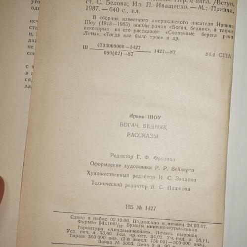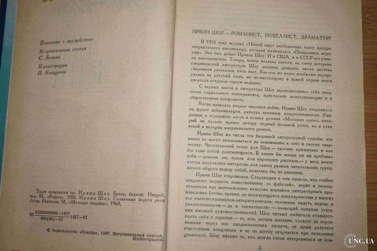 В сборник известного американского писателя Ирвина Шоу (1913-1985) вошли роман «Богач, бедняк», а также некоторые из его рассказов: «Солнечные берега реки Леты», «Тогда нас было трое» и др. Вес книги 620 гр.