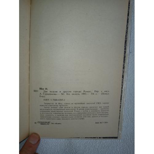 Творчество И.Шоу, одного из крупнейших писателей США, хорошо известно советскому читателю. Автор романа Две недели в другом городе предстает как тонкий исследователь человеческой психологии. В центре повествования проблема сохранения нравственных ценностей. Роман о любви и ненависти, нежности и жестокости, одиночестве человека, его стремлении разгадать свою внутреннюю сущность, о насилии как неотъемлемой составной части современной цивилизации сочетает стремительное развитие действия, яркость и колоритность характеров мира западного кинематографа.