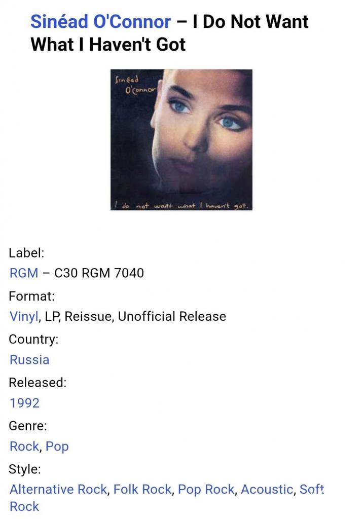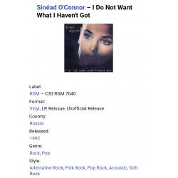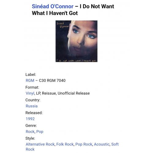1981-2000Вінілова платівка. Другий, в дискографії, студійний, альбом, Ірландської поп-рок виконавиці, покійної вже Шинейд Марі Бернадетт О'Коннор (I Do Not Want What I Heaven't Got) 1990. Випущено фірмою (RGM) Russia, 1992-ий рік. Неофіційне видання (Unofficial Release). Стан платівки ЕХ+. Стан конверту ЕХ+. Відправка по Україні службами доставки: Нова Пошта, Укр Пошта, Делівері. Також відправляємо посилки за кордон по цілому світу.