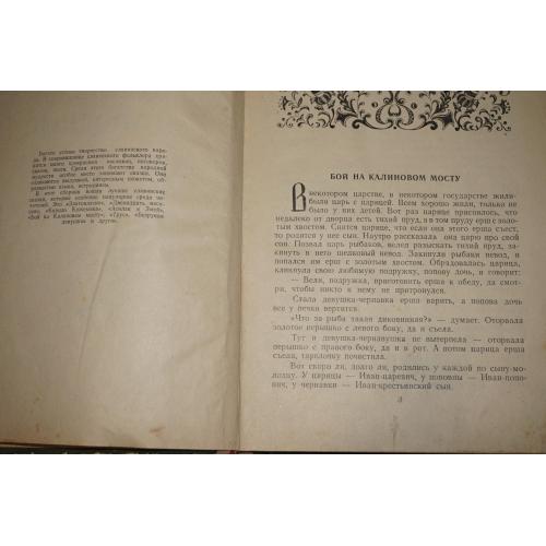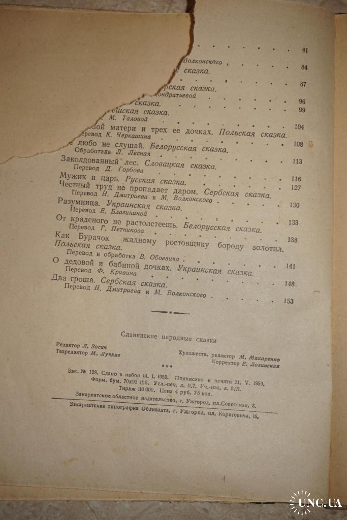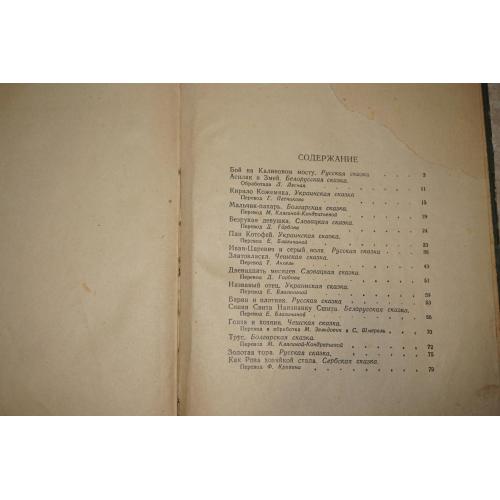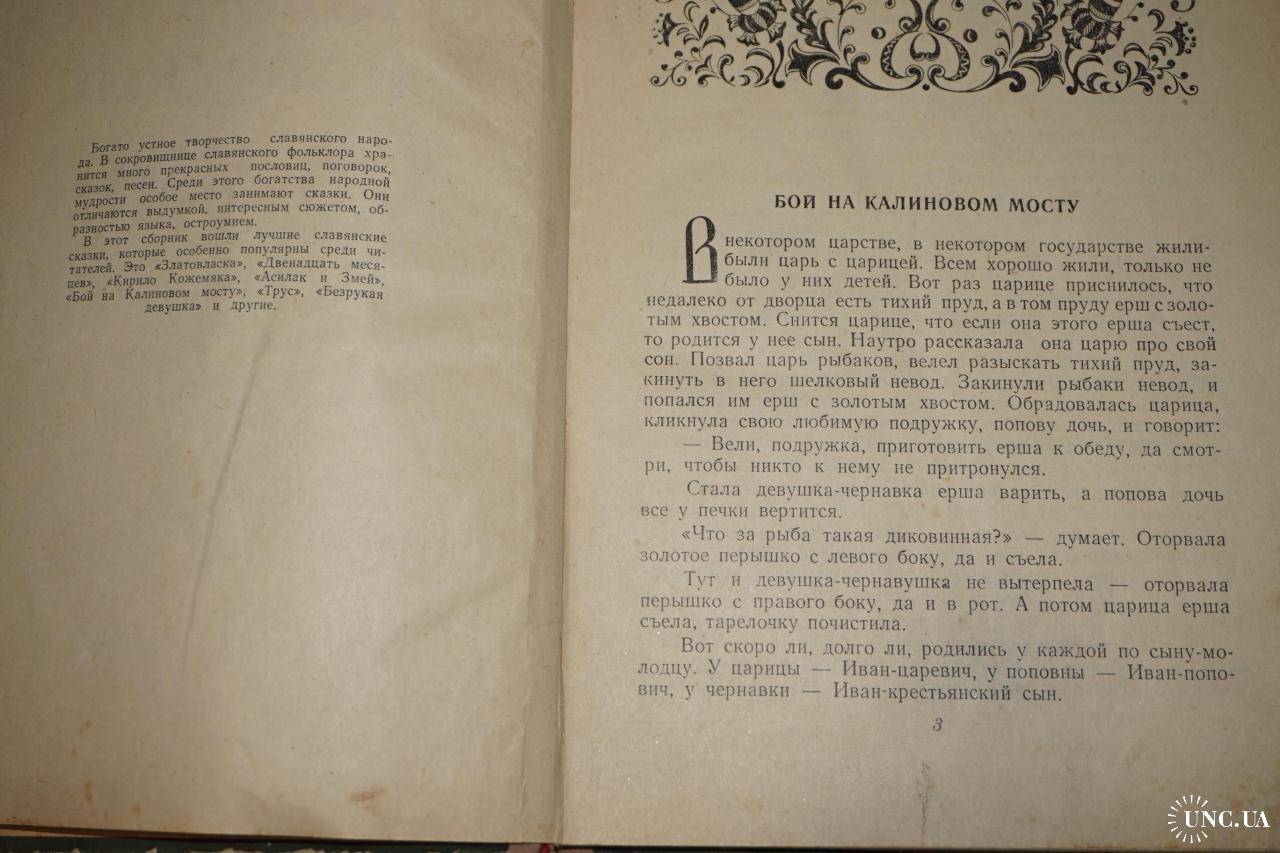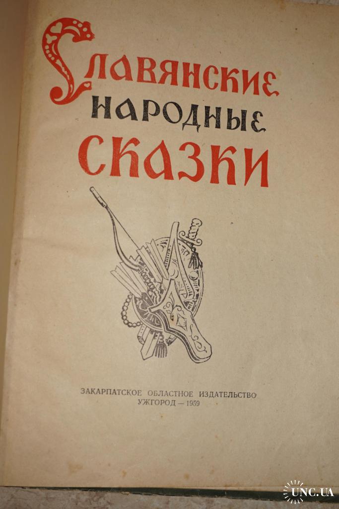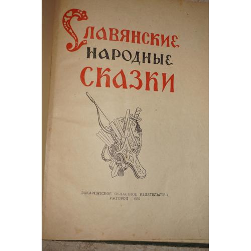 Составил Л. Ларич. Цветные вклейки В. Форостецкого. В сборник вошли лучшие славянские сказки в переводах Г. Петникова, М. Калягиной-Кондратьевой, Е. Благининой, Ф. Кривина, Д. Горбова, М. Тарловой, Т. Аксель и др. Ужгород: Закарпатское областное изд-во 1959г. 148 с. Палiтурка / переплет: Твердый, увеличенный формат.