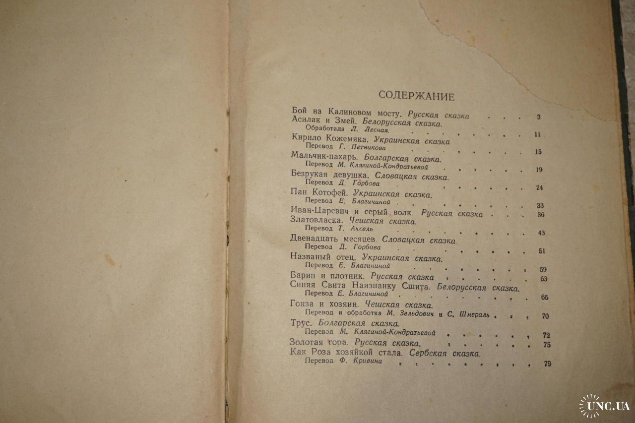 С о д е р ж а н и е. Русские сказки: Бой на Калиновом мосту. Иван-Царевич и серый волк. Барин и плотник. Золотая гора. Батрак. Мужик и царь. – Белорусские сказки: Асилак и Змей. Синяя Свита Наизнанку Сшита. Не любо не слушай. От краденого не растолстеешь. - Украинские сказки: Кирило Кожемяка. Котофей. Названый отец. Трем-сын-Борис. Разумница. О дедовой и бабиной дочках. – Словацкие сказки: Безрукая девушка. Двенадцать месяцев. Заколдованный лес. – Чешские сказки: Пан. Златовласка. Гонза и хозяин. Либушка. – Болгарские сказки: Трус. Волшебная дудка. – Сербские сказки: Как Роза хозяйкой стала. Три угря. Честный труд не пропадает даром. Два гроша. – Польские сказки: Глупый волк. О больной матери и ее трех дочерях. Как Бурачок жадному ростовщику бороду золотил.