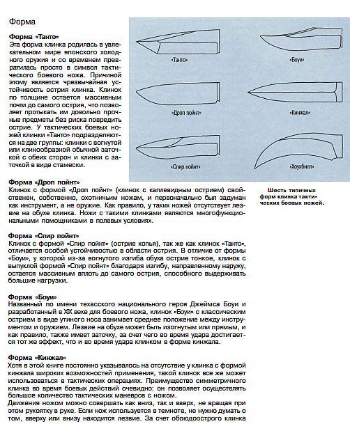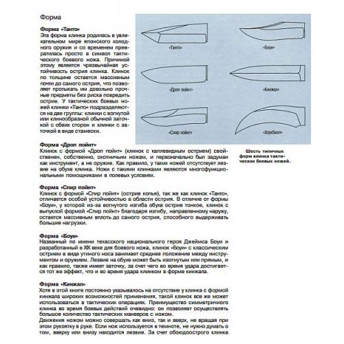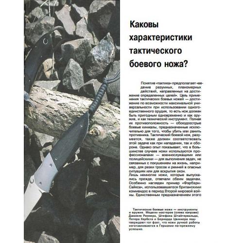 Дано описание около 200 всевозможных моделей ножей, рассказано о возможностях их применения и о материалах, использующихся для изготовления ножей.