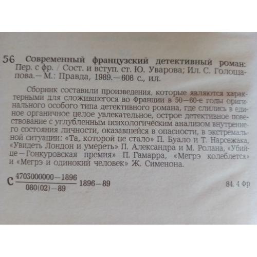 Современный Французский детективный роман. Буало, Нарсежак. Александр, Ролан. Гамарра. Сименон. Издательство: Правда. 1989 год. В отличном состоянии!