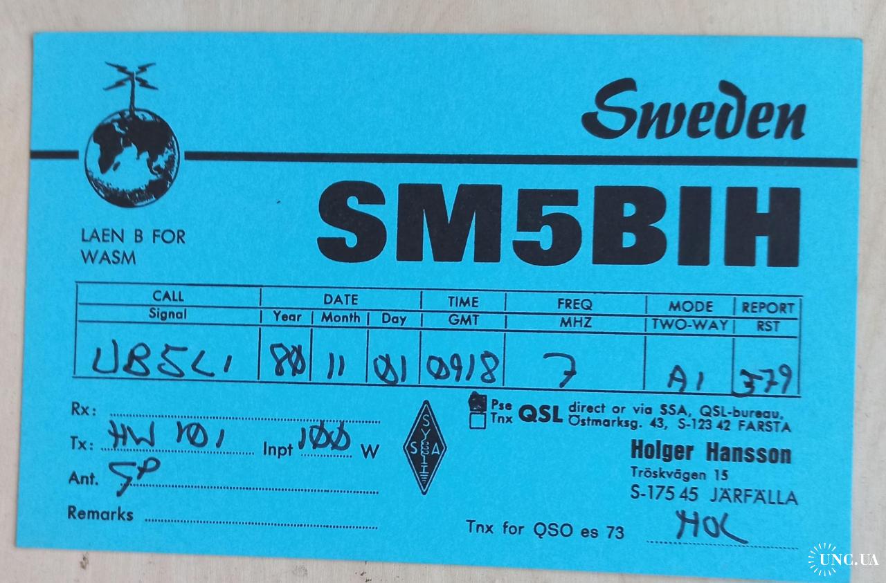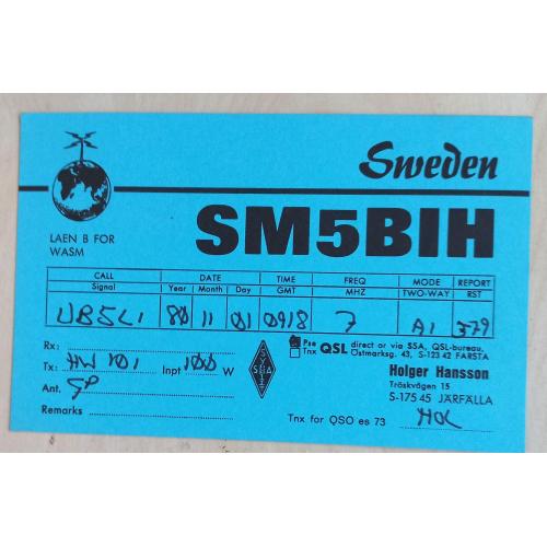 Другая темаЭта марка-наклейка позволяет отправлять QSL-карточки из Швеции, подтверждающие установленные радиосвязи, по всему миру своим коллегам по эфиру. На лицевой стороне Приведен позывной-сигнал шведа и данные радиообмена.В частности эта радиосвязь была установлена с Украиной, г. Харьков. Абонентом шведа был лично я, и в данных указан мой коротковолновый позывной-сигнал UB5LI. Состояние марки и карточки без дефектов. Качество отличное.