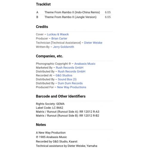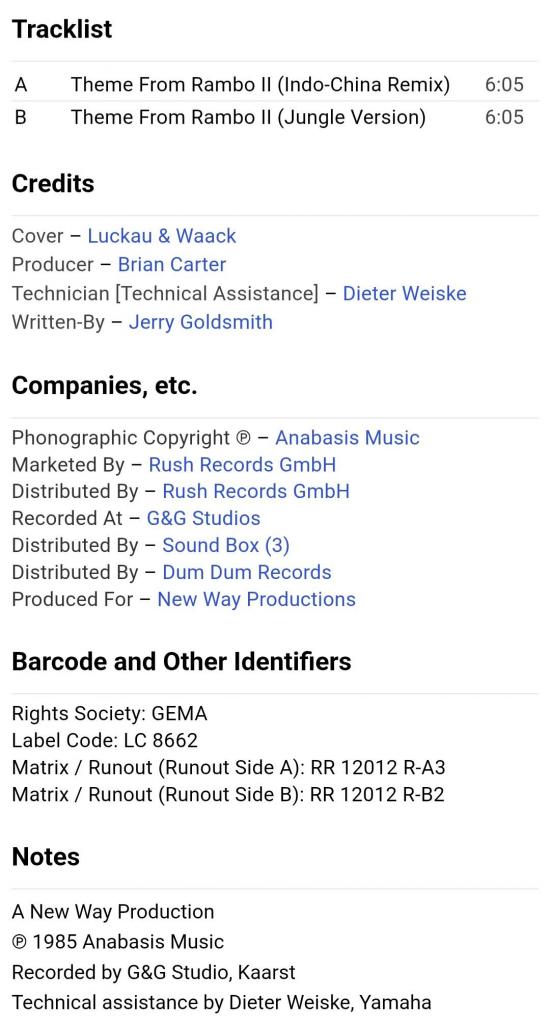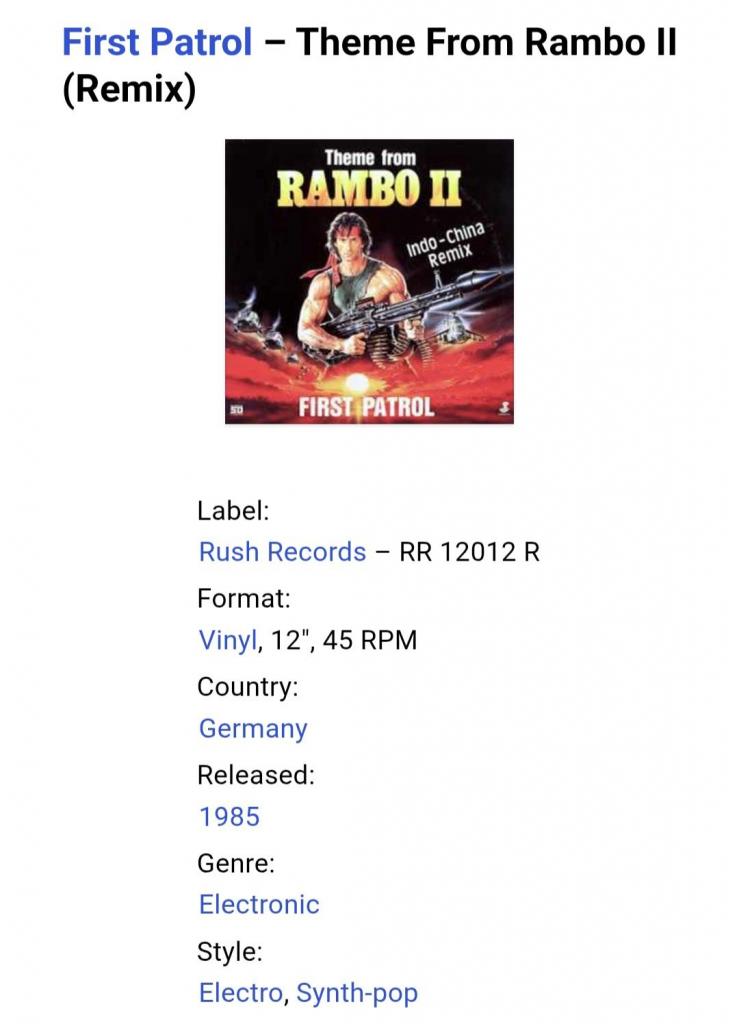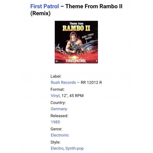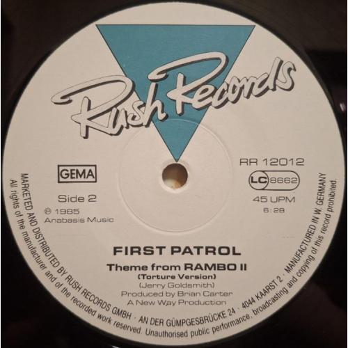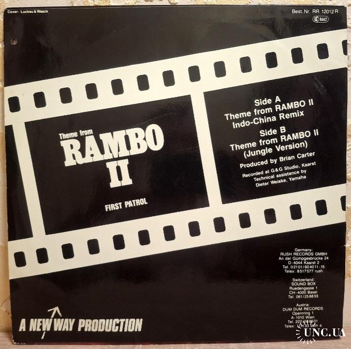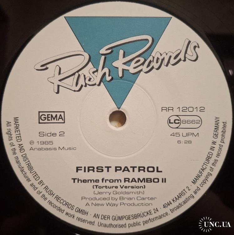 Вінілова платівка. Саундтрек. Максі Сингл (ЕР 12). Музика з популярного кінофільму бойовика, за участю легендарного Американського кіноактора Сільвестра Сталлоне (First Patrol. Theme From Rambo II. Indo-China Remix) 1985. Випуск фірми (Rush Records) Germany, 1985-ий рік. Оригінальне, першопресове видання. Стан платівки ЕХ+. Стан конверту ЕХ+. Відправка по Україні службами доставки: Нова Пошта, Укр Пошта, Делівері. Також відправляємо посилки за кордон по цілому світу.