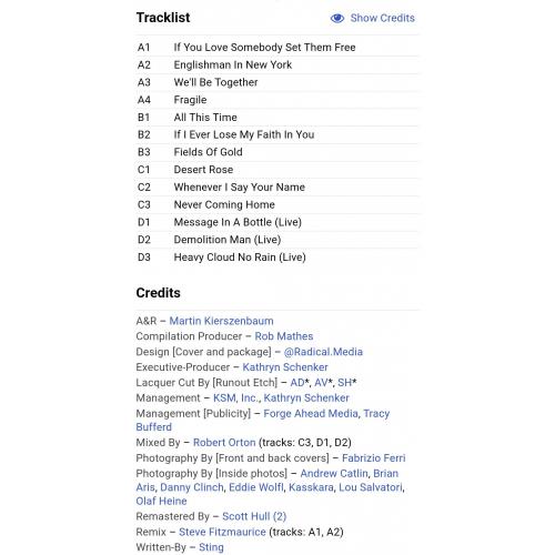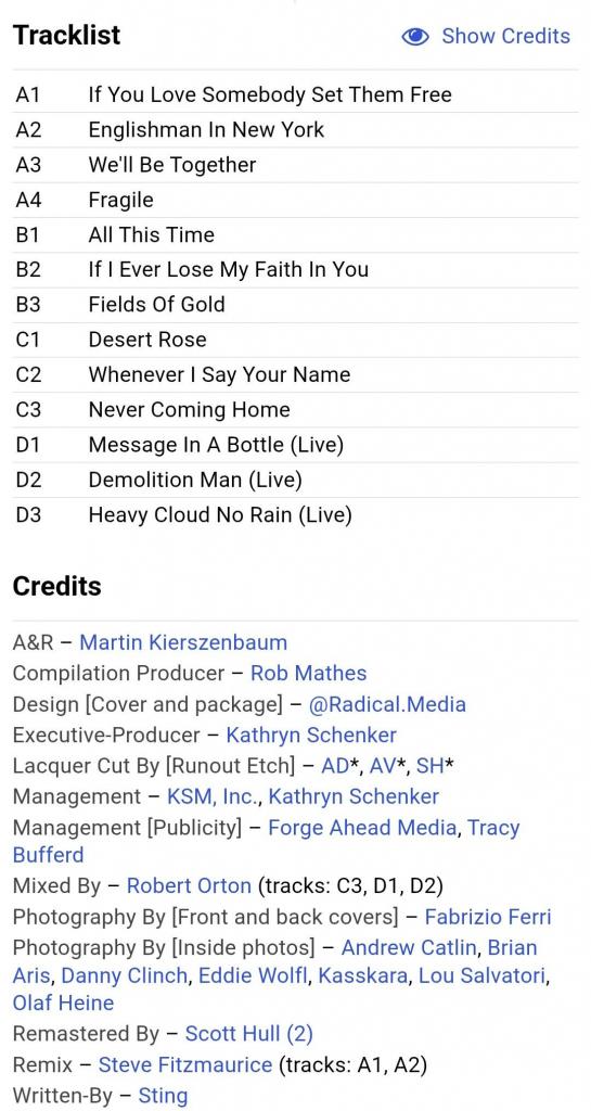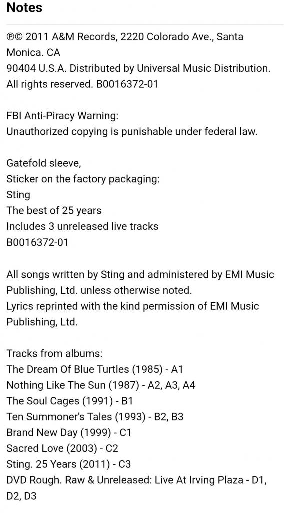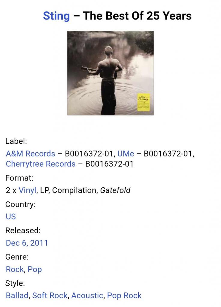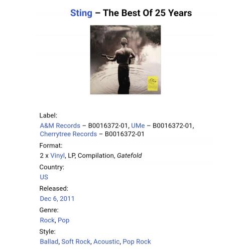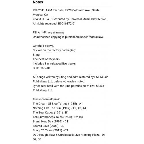 Вінілові платівки. Офіційна збірка найкращих хітів, Британського поп-рок музиканта, бувшого учасника групи The Police, Гордона Метью Томаса Самнера, більше відомого під сценічним ім,ям Стінг (The Best Of 25 Years) 1981-99. Випуск фірми (A&M Records / Cherrytree Records / UMe) USA, 2011-ий рік. Оригінальне, Штатовське видання з двох платівок (2LP). Нове, запаковане. Категорія S/S. Відправка по Україні службами доставки: Нова Пошта, Укр Пошта, Делівері. Також відправляємо посилки за кордон по цілому світу.