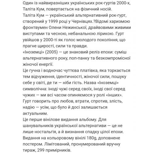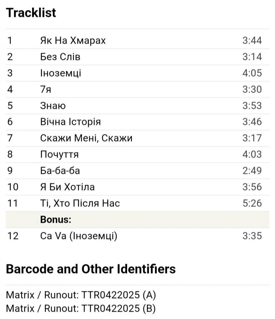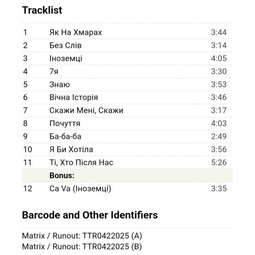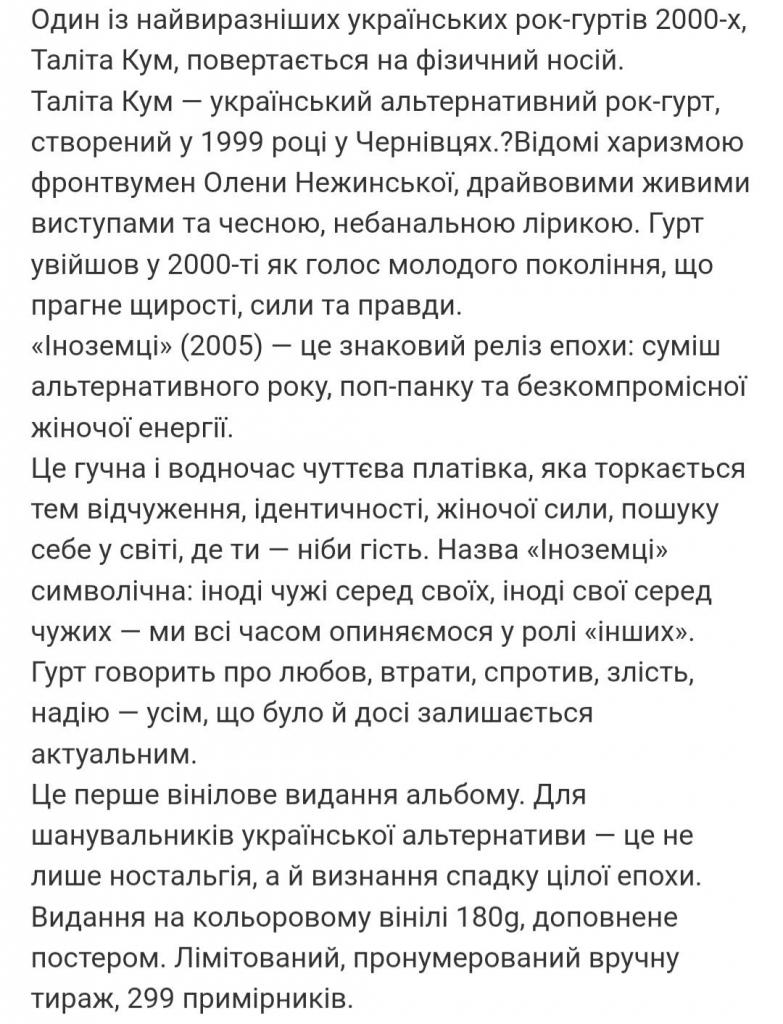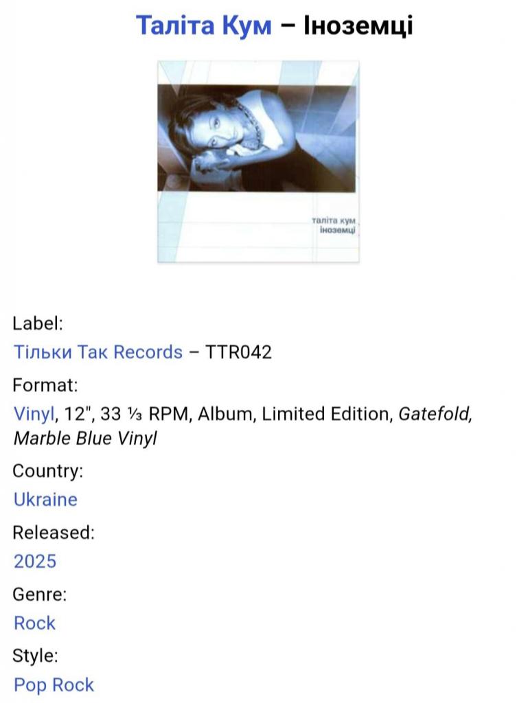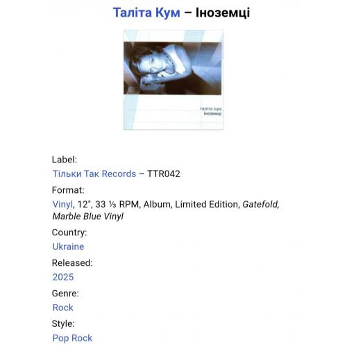 Вінілова платівка. Перший, дебютний, в дискографії, студійний альбом Української поп-рок групи із Чернівців, Таліта Кум до складу якої входили Юлія Міщенко, Сергій Глушко, Сергій Мінченко, Олексій Лінник та Костянтин Сухоносов (Іноземці) 2002. Випуск фірми (Тільки Так Records) Ukraine, 2025-ий рік. Кольоровий вініл (Coloured Vinyl). Лімітований тираж (Limited Edition). Нове, запаковане видання. Категорія S/S. Відправка по Україні службами доставки: Нова Пошта, Укр Пошта, Делівері. Також відправляємо посилки за кордон по цілому світу.
