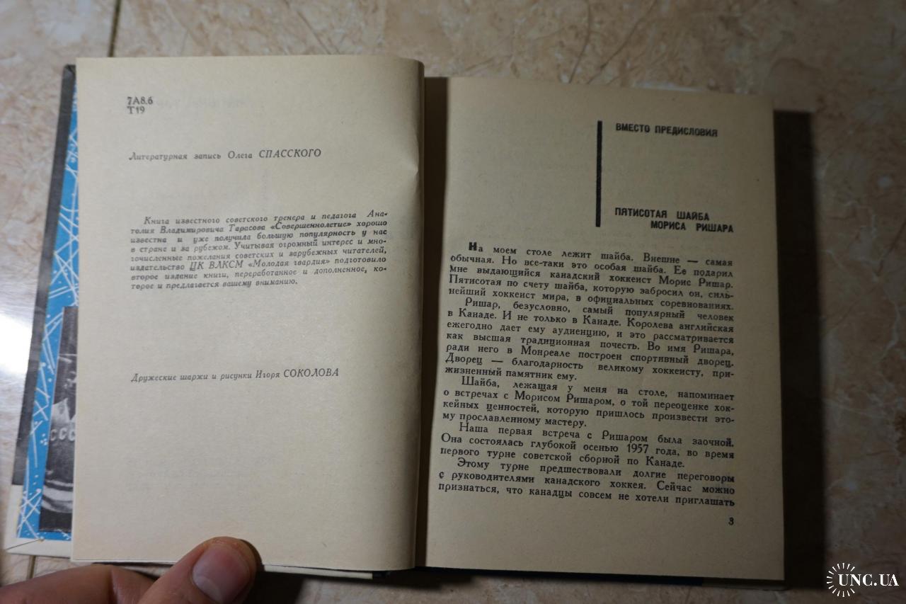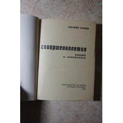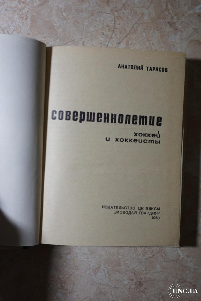Прижизненное, первое издание. Книга известного советского хоккейного тренера и педагога Анатолия Владимировича Тарасова «Совершеннолетие» хорошо известна и получила большую популярность у нас в стране и за рубежом. Литературная запись Олега Спасского. Тарасов Анатолий Владимирович (1918 - 1995) - советский хоккеист и тренер сборной СССР, 3 раза завоевавшей олимпийское первенство (в 1964, 1968, 1972 годах) и 9 раз - первенство мира. Из книги: `На моем столе лежит шайба. Внешне – самая обычная. Но все-таки это особая шайба. Ее подарил мне выдающийся канадский хоккеист Морис Ришар. Пятисотая по счету шайба, которую забросил он, сильнейший хоккеист мира, в официальных соревнованиях. Ришар, безусловно, самый популярный человек в Канаде. И не только в Канаде. Королева английская ежегодно дает ему аудиенцию, и это рассматривается как высшая традиционная почесть. Во имя Pишара, ради него в Монреале построен спортивный Дворец – благодарность великому хоккеисту, жизненный памятник ему. Хоккей – это соревнование не только мужества и скорости. Это и соревнование умов. Лишь тот может мечтать о победах, кто умеет мгновенно, как шахматист в цейтноте, разбираться в самых сложных, постоянно изменяющихся ситуациях, кто научился едва ли не ежесекундно находить наилучшее решение из всех возможных, кто умеет, наконец, предвидеть, предугадывать дальнейший ход происходящих на хоккейном поле событий. Хоккеисту нужна не только мудрость шахматиста, но и точность снайпера. Отдать шайбу прямо на клюшку мчащегося партнера, попасть на большой скорости в незащищенный уголок ворот – право же, ничуть не легче, чем пять раз подряд выстрелить из пистолета в заветную «десятку`