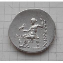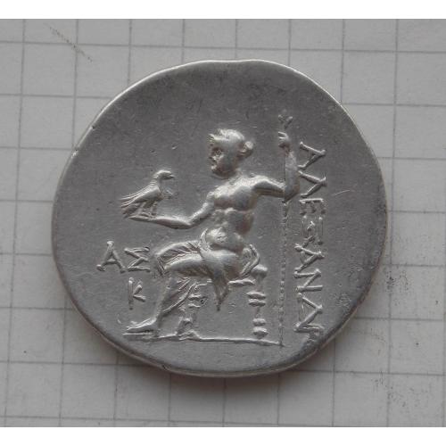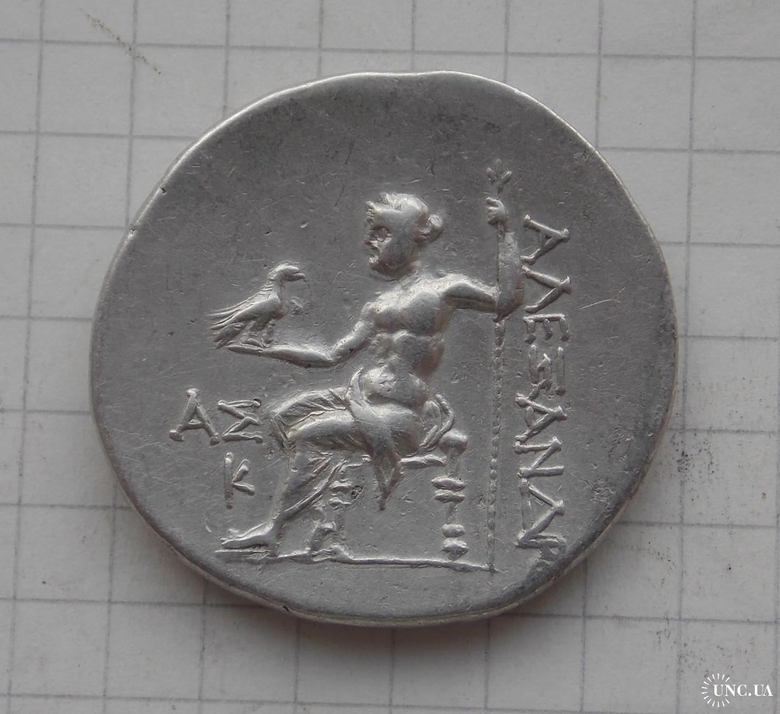 реверс: ΑΛΕΞΑΝΔΡΟΥ. Зевс сидить ліворуч на низькому троні, тримаючи довгий скіпетр у лівій руці та орла з закритими крилами в правій; ліворуч, ΑΣ над Κ (дата).