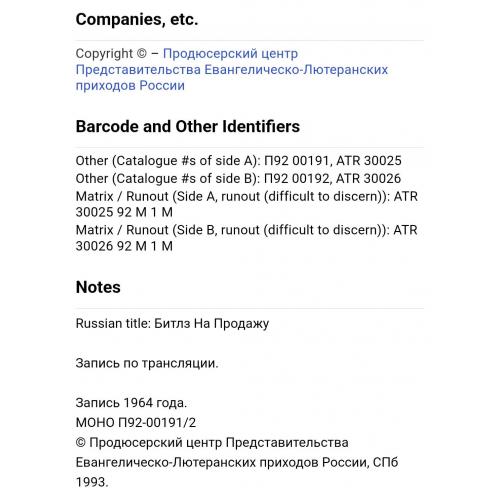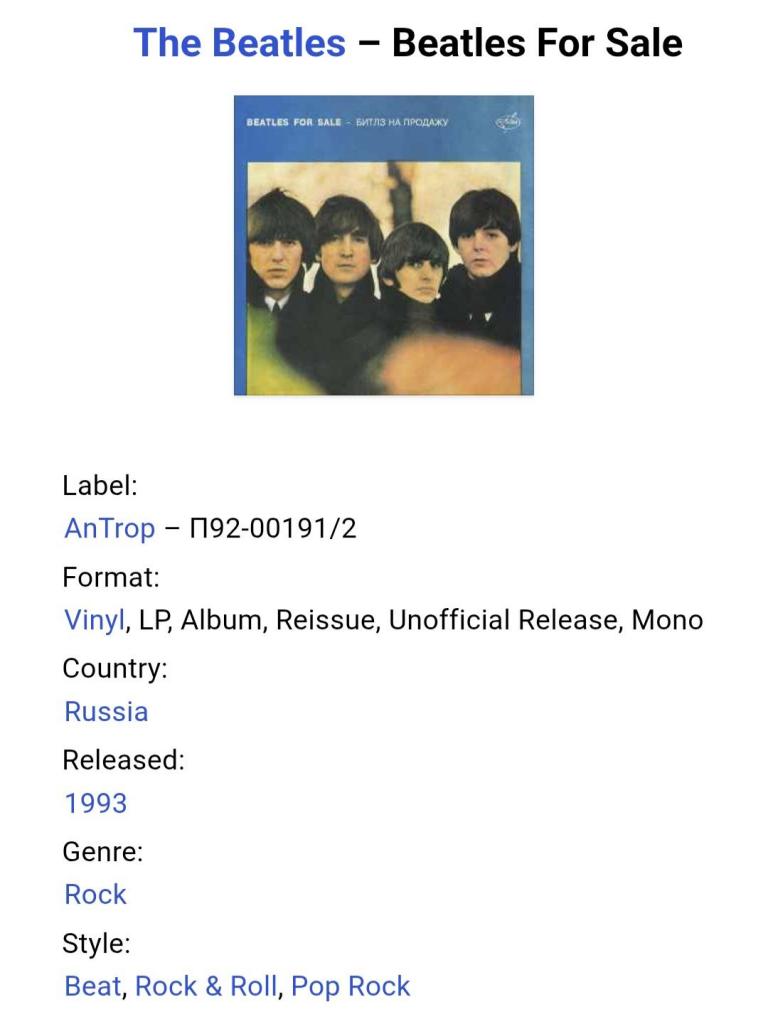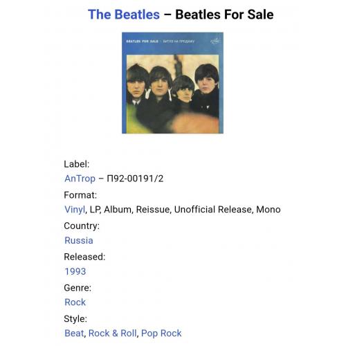 Вінілова платівка. Четвертий, в дискографії, студійний альбом легендарної Британської біг-біт, рок-групи із Ліверпуля, The Beatles, яка складалась на той час з учасників Джона Леннона, Пола Маккартні, Джорджа Харрісона та Рінго Старра (Beatles For Sale) 1964. Випуск фірми (Antrop) Russia, 1993-ій рік. Стан платівки NM. Стан конверту NM-/EX+. Відправка по Україні службами доставки: Нова Пошта, Укр Пошта, Делівері. Також відправляємо посилки за кордон по цілому світу.