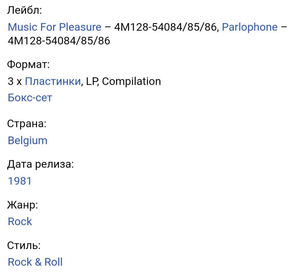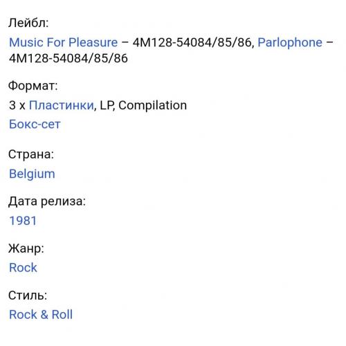 1961-1980Оригинальные фирменные виниловые пластинки. Сборник рок-н-рольных хитов легендарной Ливерпульской четверки The Beatles и их фронтмена John Lennon: Rock 'N'Roll - 1963-75, в коробке Box Set из трех пластинок (3LP). Редкое (Rare). Выпущено фирмой (Parlophone / Music For Pleasure) Belgium в 1981-ом году. Состояние пластинок ЕХ+. Состояние бокса ЕХ+. Отправляем Новой Почтой, Деливери, Укр Почтой /Предоплата/ (На выбор покупателя), возможна отправка за границу.