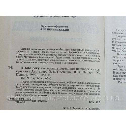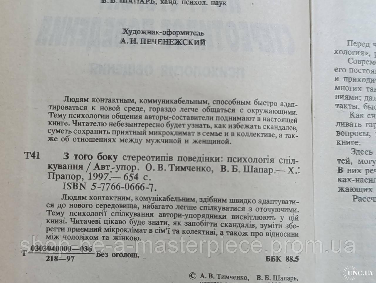 Тимченко О.В.,Шапарь В.Б. ПО ТУ СТОРОНУ СТЕРЕОТИПОВ ПОВЕДЕНИЯ. Психология общения 1997 БИБЛИОТЕКА ЗАНИМАТЕЛЬНОЙ ПСИХОЛОГИИ Твердая обложка. Состояние отличное. Есть два оттиска штампа на внутренней части задней обложки Харьков "Прапор" 654 стр. 1997г Художник-оформитель А. Н. ПЕЧЕНЕЖСКИЙ Людям контактным, коммуникабельным, способным быстро адаптироваться к новой среде, гораздо легче общаться с окружающими. Тему психологии общения авторы-составители поднимают в настоящей книге. Читателю небезынтересно будет узнать, как избежать скандалов, суметь сохранить приятный микроклимат в семье и в коллективе, а так-же об отношениях между мужчиной и женщиной.Ответы продавца на ваши вопросы