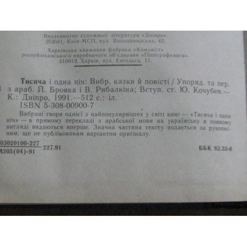 Вибрані твори однієї з найпопулярніших у світі книг - `Тисяча і одна ніч` - в прямому перекладі з арабської мови на українську в повному вигляді видаються вперше. Значна частина тексту подається за рукописним, ще не публікованим варіантом оригіналу. 512с.,іл.
