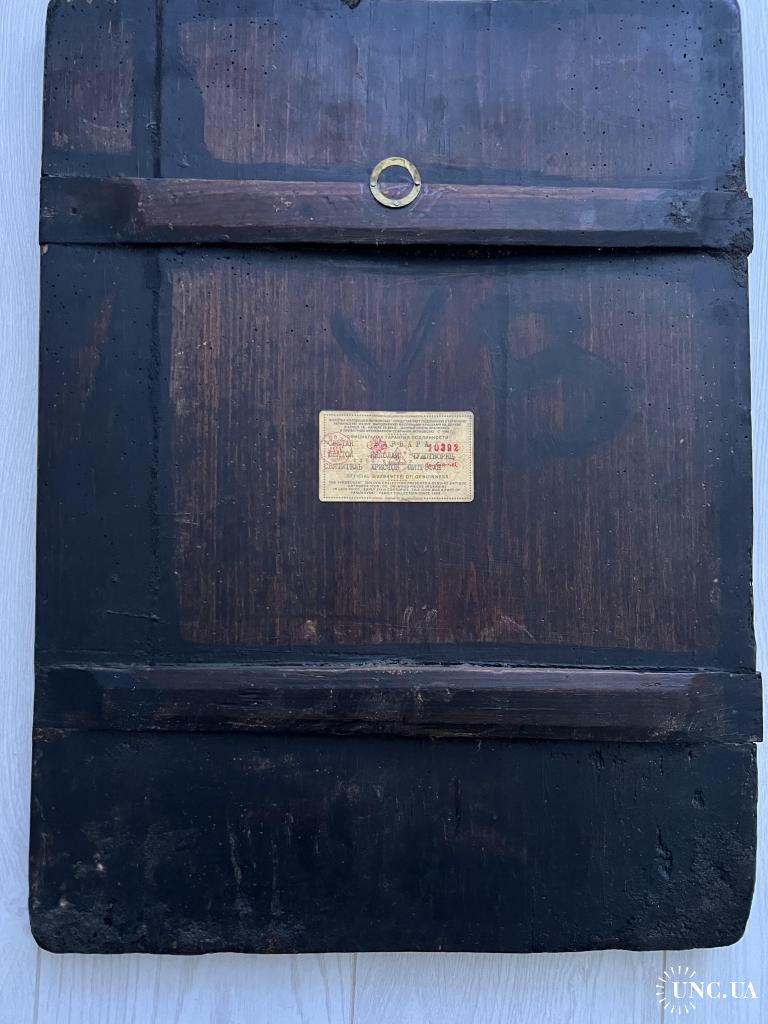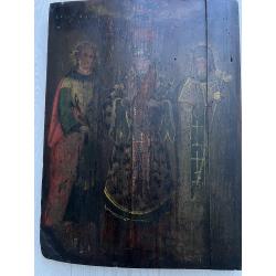 Стан: оригінальний антикварний — природний знос віку: тріщини по дошці (типово для старого дерева), кракелюр, потертості, патіна. Без реставрації, лики чіткі, кольори яскраві. Все автентичне!