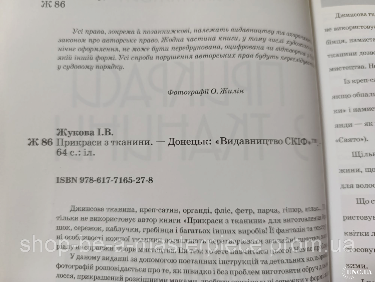 Украшения из ткани Ирина Жукова 2015 г. Количество страниц 64 Цветные иллюстрации Обложка Мягкая Формат 70х100/ 16 (170х240) Язык украинский Состояние новойОтветы продавца на ваши вопросы