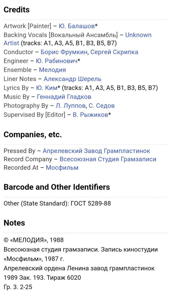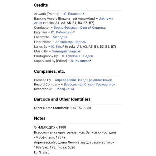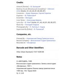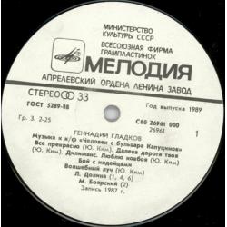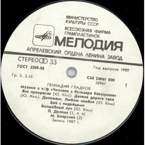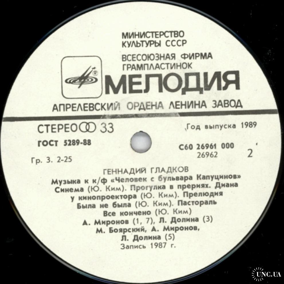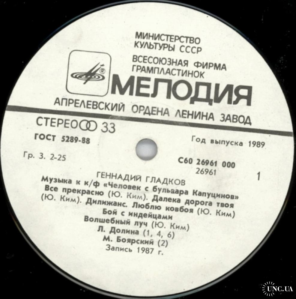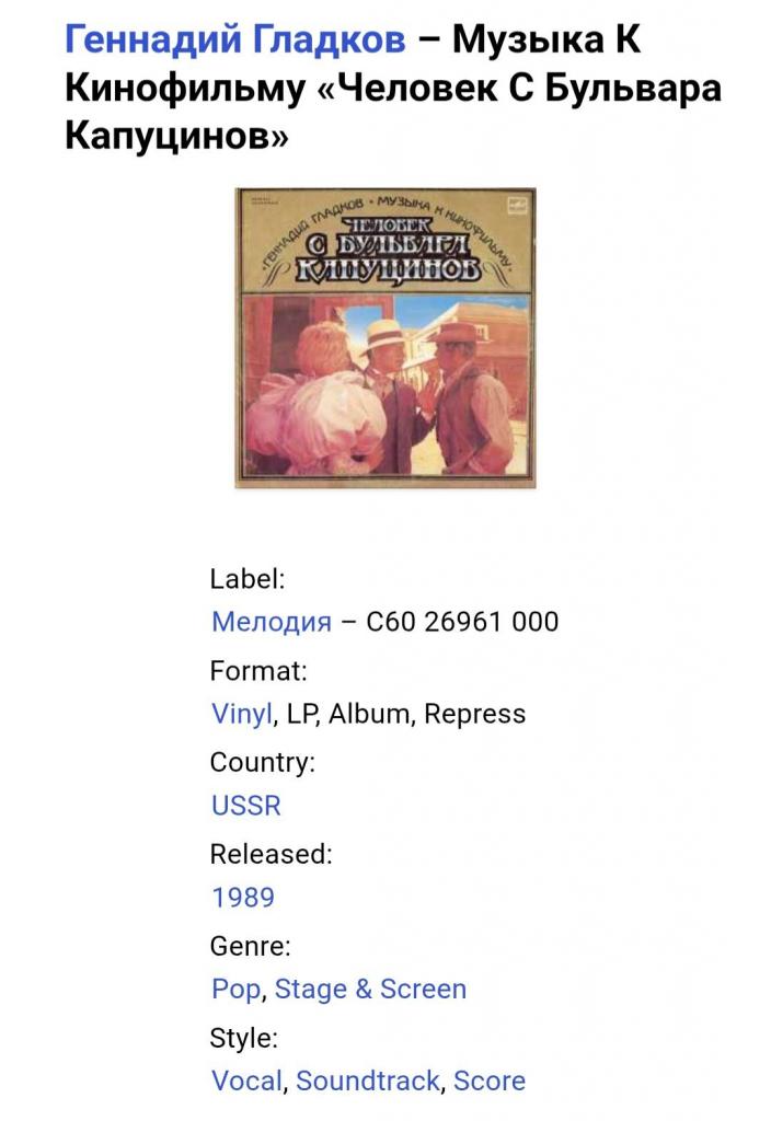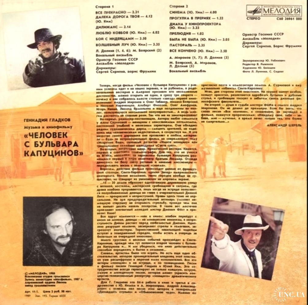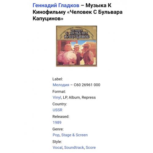 Вінілова платівка. Саундтрек. Музика російського (радянського) композитора до легендарного кінофільму, у виконанні таких виконавців як Андрій Миронов, Лариса Доліна, Михайло Боярський та оркестр Держкіно СРСР (Человек с Бульвара Капуцинов) 1987. Випуск фірми (Мелодія) СРСР, Апрелєвський завод грамплатівок, 1989-ий рік. Платівка нова, неіграна, під голкою не була. Категорія М (Mint). Стан конверту NM-. Відправка по Україні службами доставки: Нова Пошта, Укр Пошта, Делівері. Також відправляємо посилки за кордон по цілому світу.