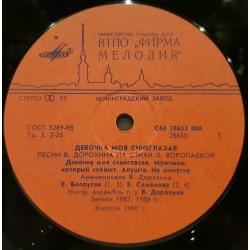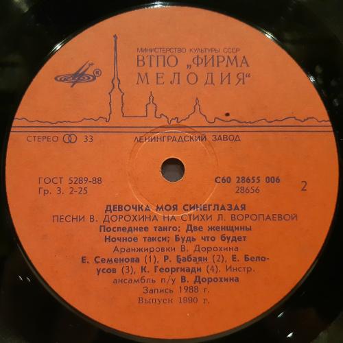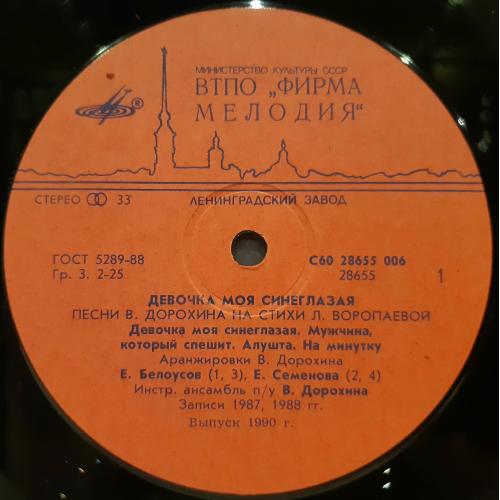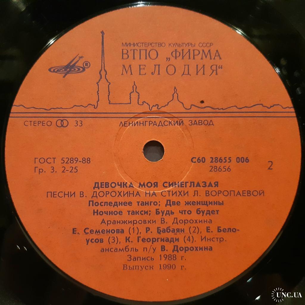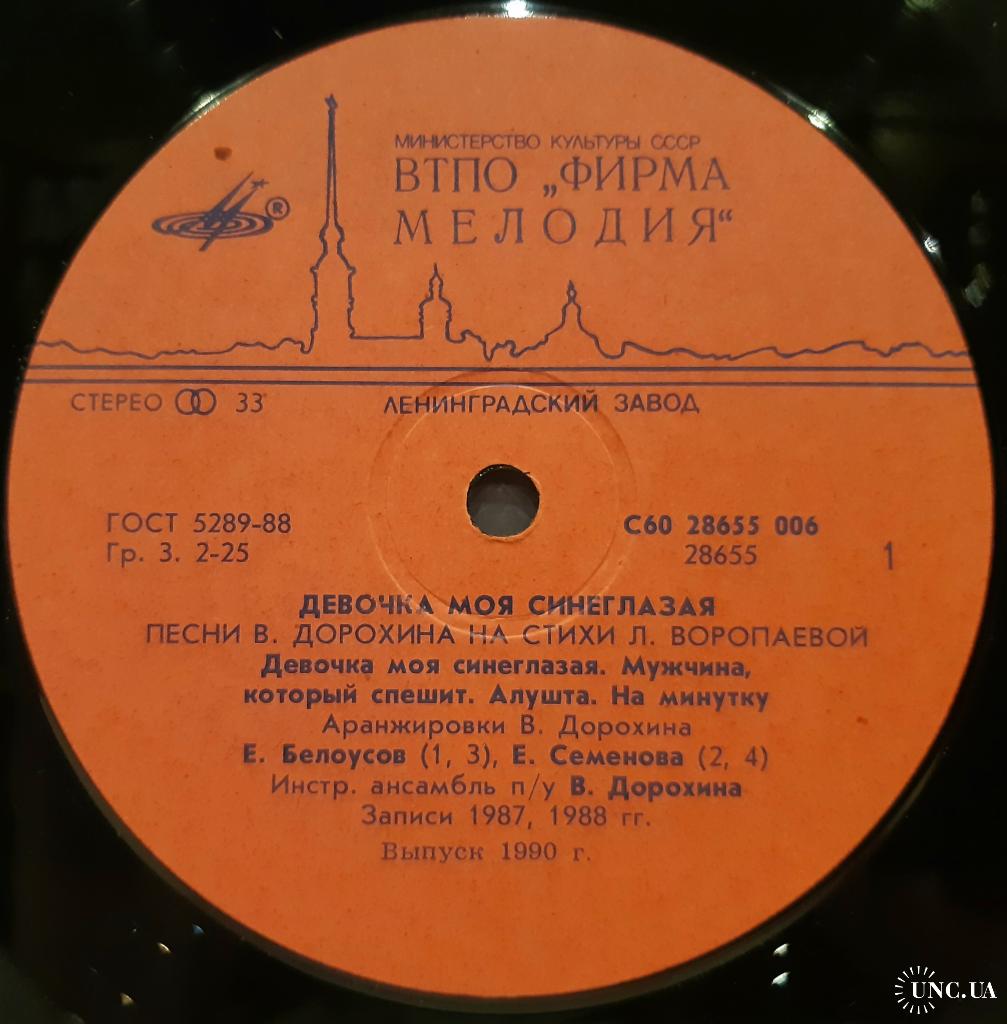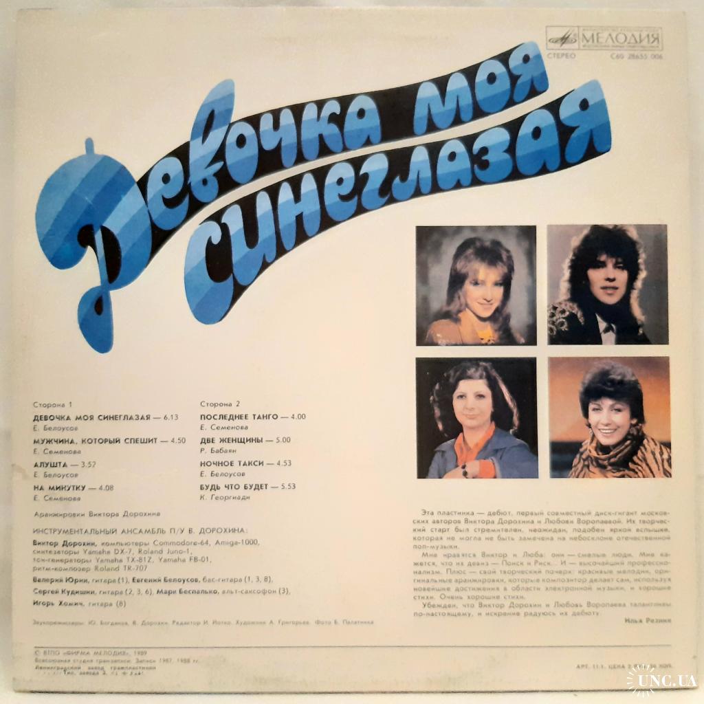 Оригинальная виниловая пластинка. Ретро-сборник Советской Эстрады: Девочка Моя Синеглазая (Песни В. Дорохина и Л. Воропаевой) 1987, 1988. Выпущено фирмой (МЕЛОДИЯ) СССР, Ленинградским заводом в 1991-ом году. Пластинка в отличном состоянии, относится к категории ЕХ+. Глянцевый конверт. Состояние конверта EX. Отличное качество стерео звука, оригинальная обложка, цветная полиграфия. Отправляю Новой Почтой. Деливери, Ин Тайм, Укр Почтой /Предоплата/ (На выбор покупателя), возможна отправка за границу.