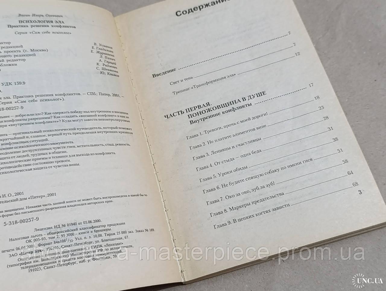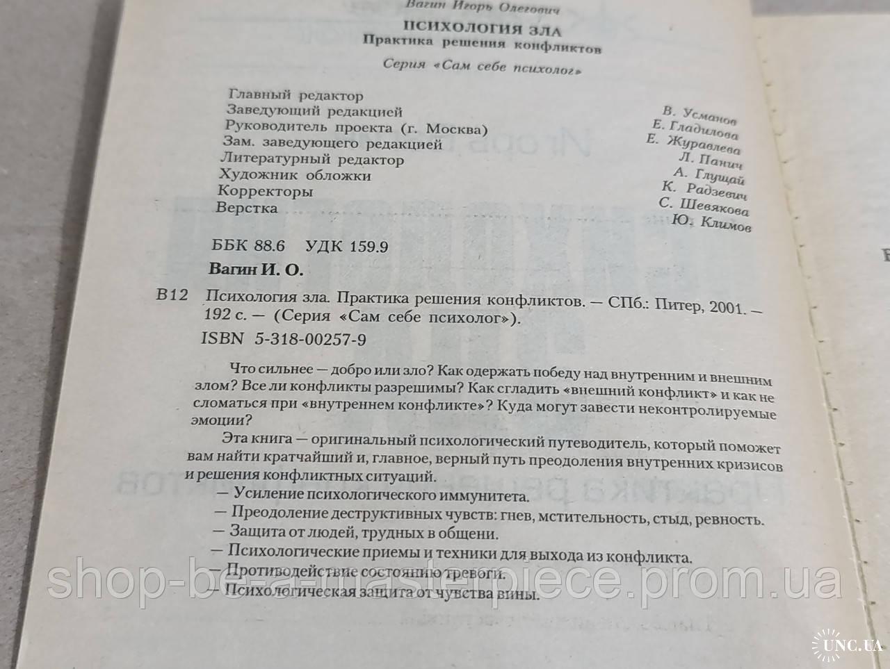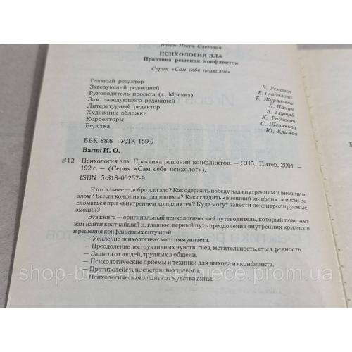 Вагин Игорь Психология зла. Практика решения конфликтов (Серия «Сам себе психолог») 2001 Мягкая обложка. Есть надрыв на боковой части обложки . На первом развороте книга начинает отклеиваться СПб.: Питер, 2001. 192 с. Что сильнее - добро или зло? Как одержать победу над внутренним и внешним злом? Все ли конфликты разрешимы? Как сгладить «внешний конфликт» и как не сломаться при «внутреннем конфликте»? Куда могут завести неконтролируемые эмоции? Эта книга оригинальный психологический путеводитель, который поможет вам найти кратчайший и, главное, верный путь преодоления внутренних кризисов и решения конфликтных ситуаций. Усиление психологического иммунитета. Преодоление деструктивных чувств: гнев, мстительность, стыд, ревность. Защита от людей, трудных в общени. Психологические приемы и техники для выхода из конфликта. Противодействие состоянию тревоги. Психологическая защита от чувства вины.Ответы продавца на ваши вопросы