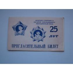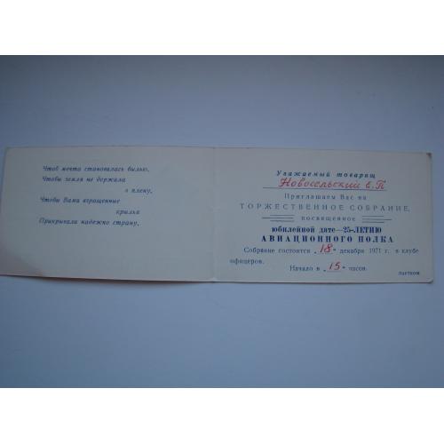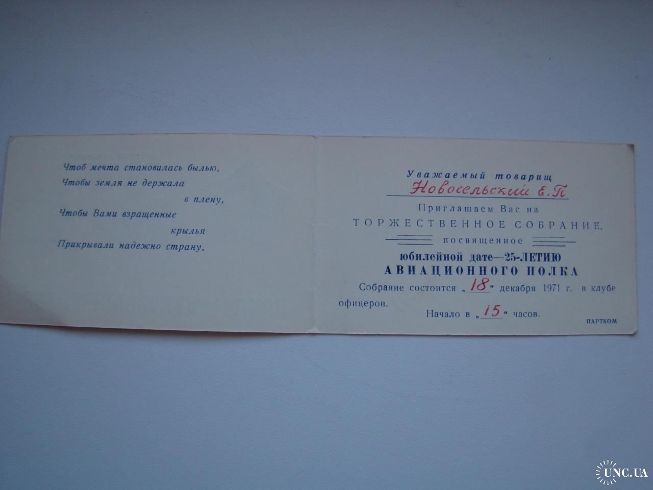 1. Пригласительный билет на Новосельского Е.П. на торжественное собрание, посвященное 25-летию Черкасского авиаполка, дата 18.12.1971 г. По всей видимости, на этом собрании и был вручен знак 25 лет Черкасскому авиаполку.