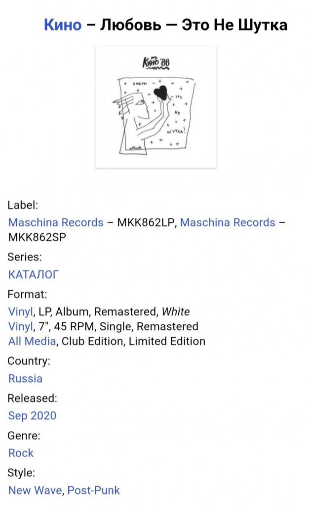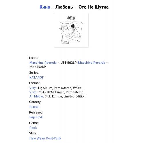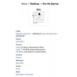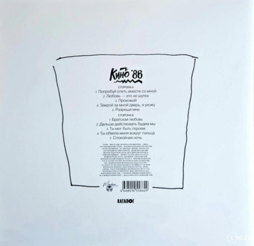 Вінілові платівки. Студійний альбом, який не увійшов в основну дискографію, а був відкладений музикантами на полицю і опублікований як архівний документ, російської (радянської) рок-групи нової хвилі, Кіно, яка складалася на той час з учасників Віктора Цоя, Юрія Каспаряна, Ігоря Тихомирова та Георгія Гур,янова (Любовь Это Не Шутка) 1986. Випуск фірми (Maschina Records) Estonia, 2020-ий рік. Видання з двох платівок (LP) 12 + (EP) 7. Білий вініл (White Vinyl). Клубне видання (Club Edition). Лімітований тираж (Limited Edition). В комплекті 12-ти сторінковий інформаційний буклет з архівними фотографіями. Видання нове, запаковане. Категорія S/S. Відправка по Україні службами доставки: Нова Пошта, Укр Пошта, Делівері. Також відправляємо посилки за кордон по цілому світу.