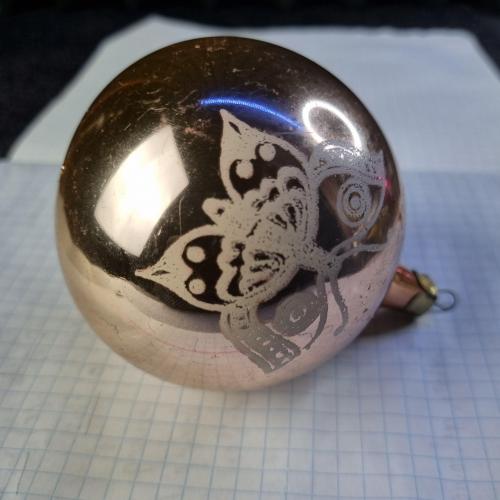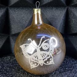 Вінтажна ялинкова прикраса у формі кулі з ручним білим декором у вигляді метелика.