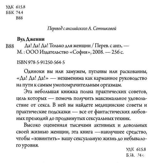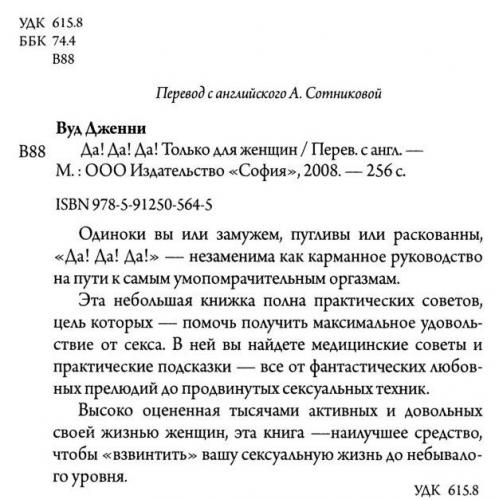 Одиноки вы или замужем, пугливы или раскованны, ''Да! Да! Да!'' - незаменима как карманное руководство на пути к самым умопомрачительным оргазмам. Эта небольшая книжка полна практических советов, цель которых - помочь получить максимальное удовольствие от секса. В ней вы найдете медицинские советы и практические подсказки - все от любовных прелюдий до продвинутых сексуальных техник.