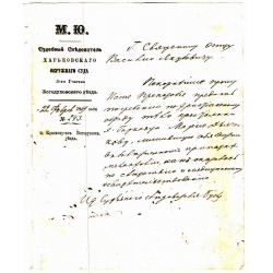 Основні деталі документа: Установа: Судовий слідчий Харківського окружного суду, 2-га дільниця Богодухівського повіту. Дата: 22 лютого 1869 року. Місце: місто Богодухів (Харківська губернія). Одержувач: Священик отець Василь Якубович. Суть справи: Слідчий просить поховати жительку села Гаркавець, Марію Дяченкову, яка вчинила самогубство. Згідно з текстом, розслідування та медичний огляд підтвердили, що це було самогубство (позбавлення себе життя).