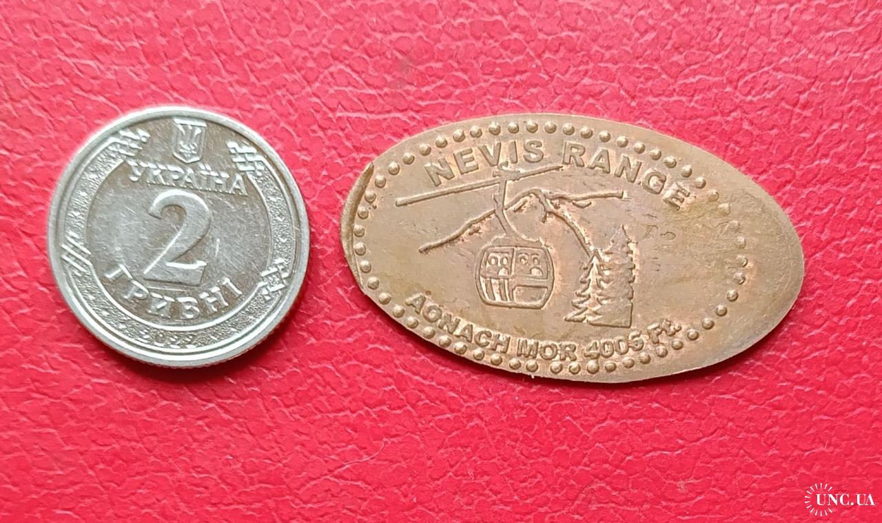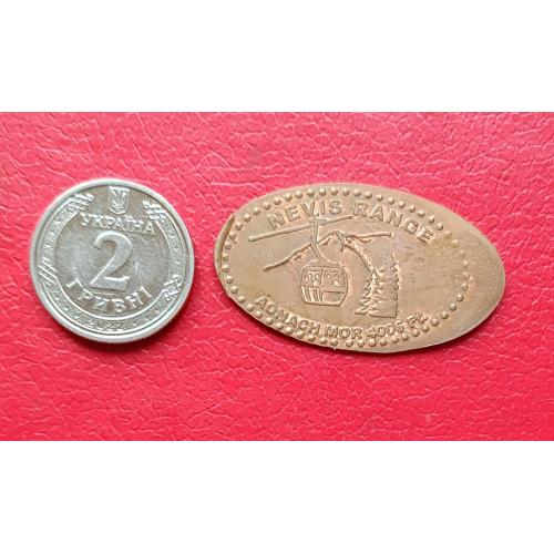 На жетоне изображена канатная дорога (кабина гондолы) и горы.