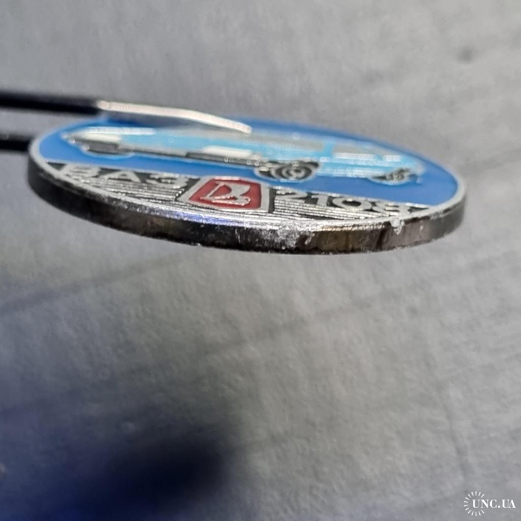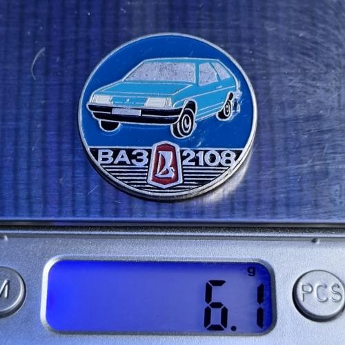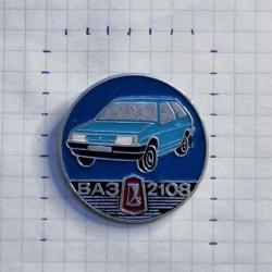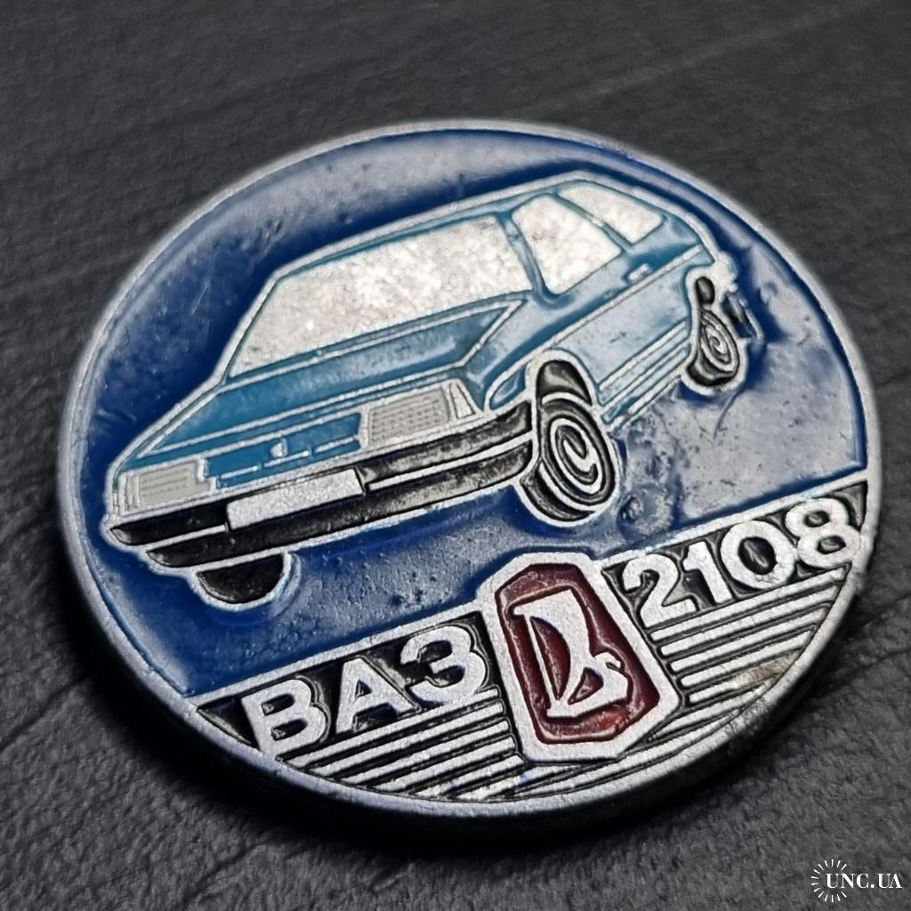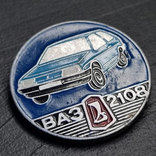 Колекційний металевий значок із зображенням автомобіля ВАЗ-2108 (Lada Samara). Оригінал радянського виробництва, 1980-ті роки. На лицьовій стороні — синій автомобіль, напис "ВАЗ 2108", логотип АвтоВАЗ. Зворотна сторона має маркування "ц30K"