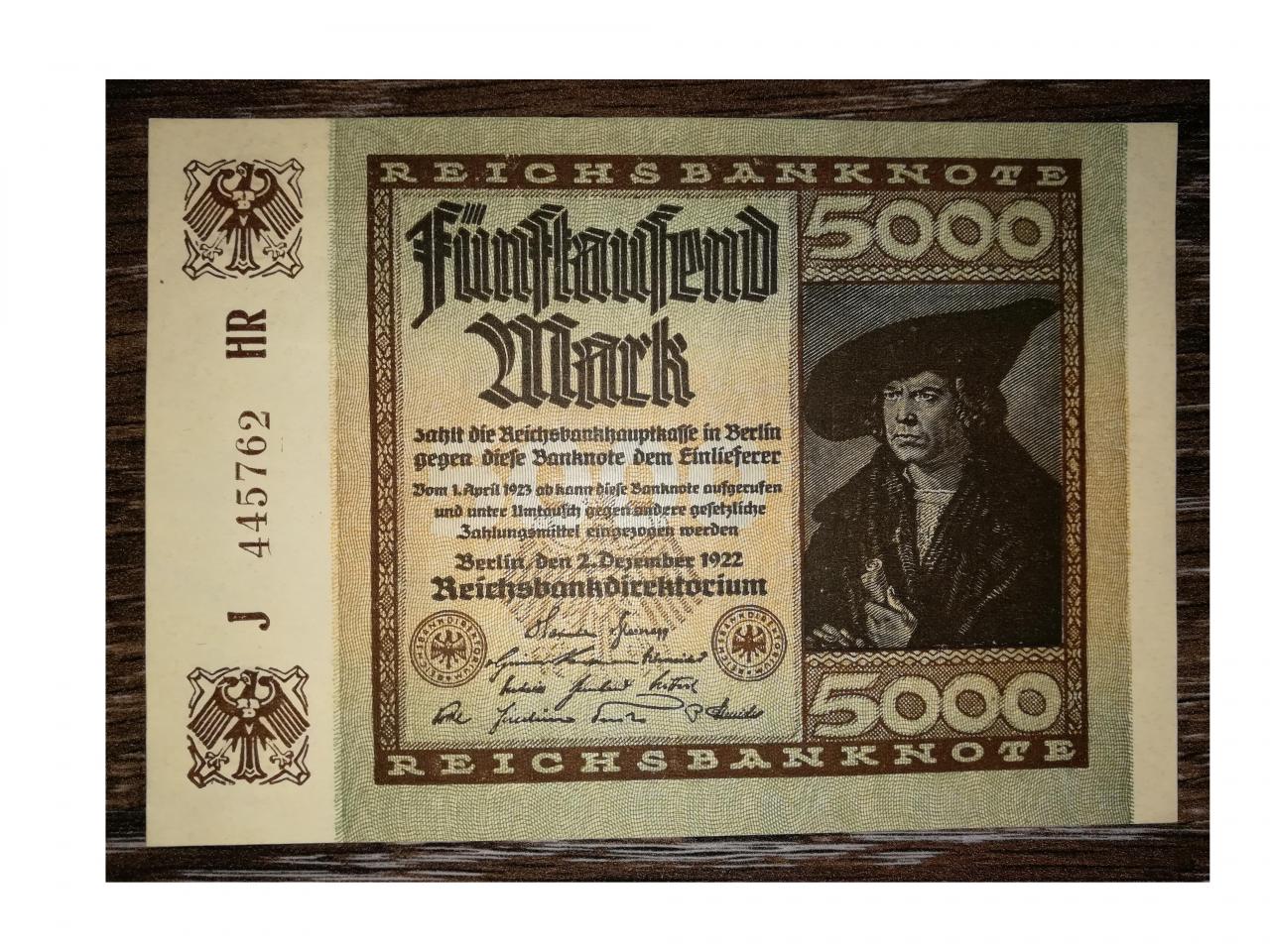 GERMANY Німеччина 5000 марок 1922 № низький, префікс - 1-а літера. UNC-. Серія HR. ВЗ: G і D в зірці