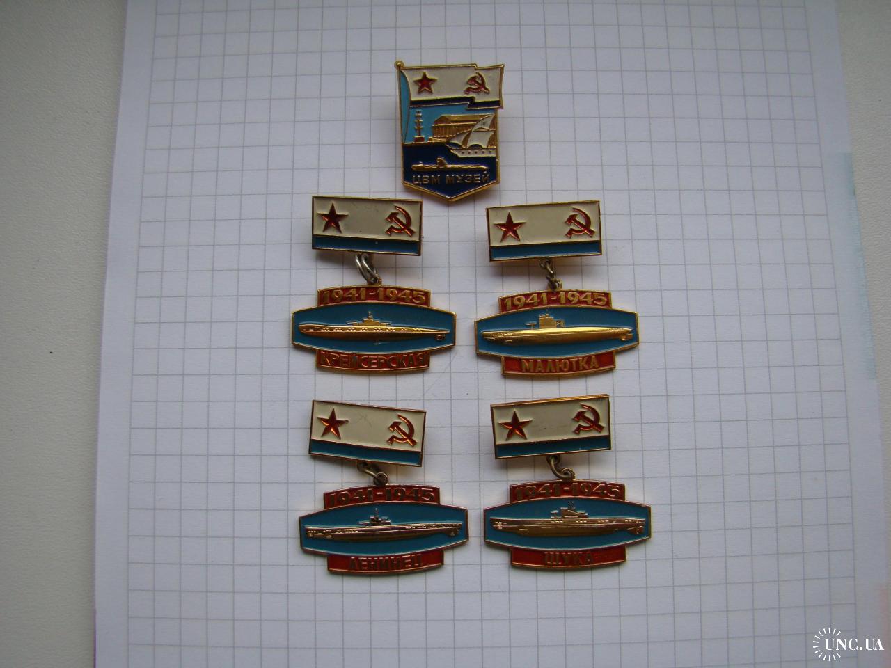 Значки Подводная лодка Крейсерская, Малютка, Ленинец, Щука и Центральный военный музей ВМФ СССР, 5шт